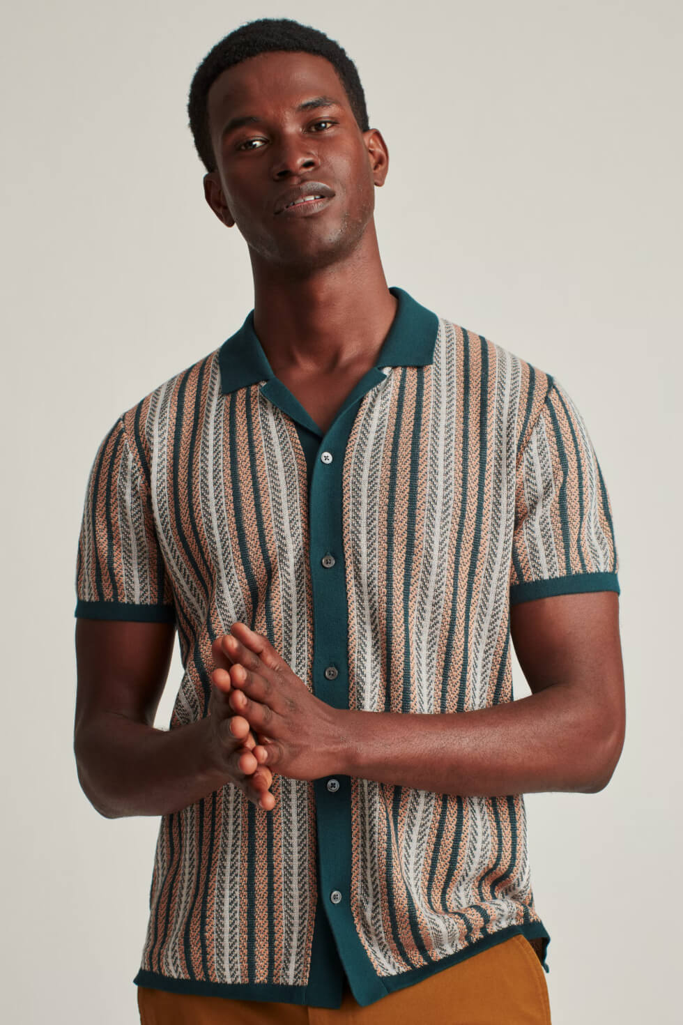 “Feels like a cotton sweater, looks like a retro cabana shirt.” This polo shirt in Orange Navy Stripe color gives you “instant polish with casual vibes” whether you’re dressed up or dressed down. It boasts a soft and breathable cotton fabric in a full placket polo body. This means its placket extends to the full length of the shirt like how button-up shirts work and it drapes down your body. This feature allows this polo to be very versatile and with a very attractive silhouette.