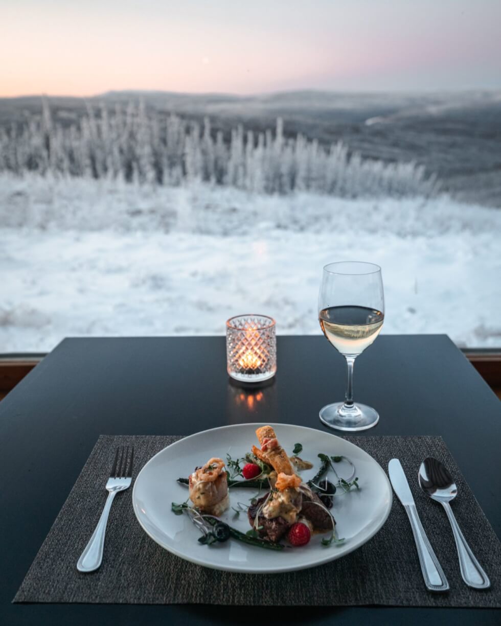 The igloos in the Borealis Basecamp are designed to maximize views of the Aurora Borealis. They have 16-foot curved windows to provide views of far-off ridges. The massive windows allow guests to view the sky in the comfort of their bed. Likewise, each igloo has a sitting area, a full bathroom, and a breakfast bar. That’s comfort and convenience akin to hotel-like living. You don’t have to venture far to find a place to clean off or eat. Although, this must-go travel destination also offers European fine dining at the on-site restaurant, Latitude 65.