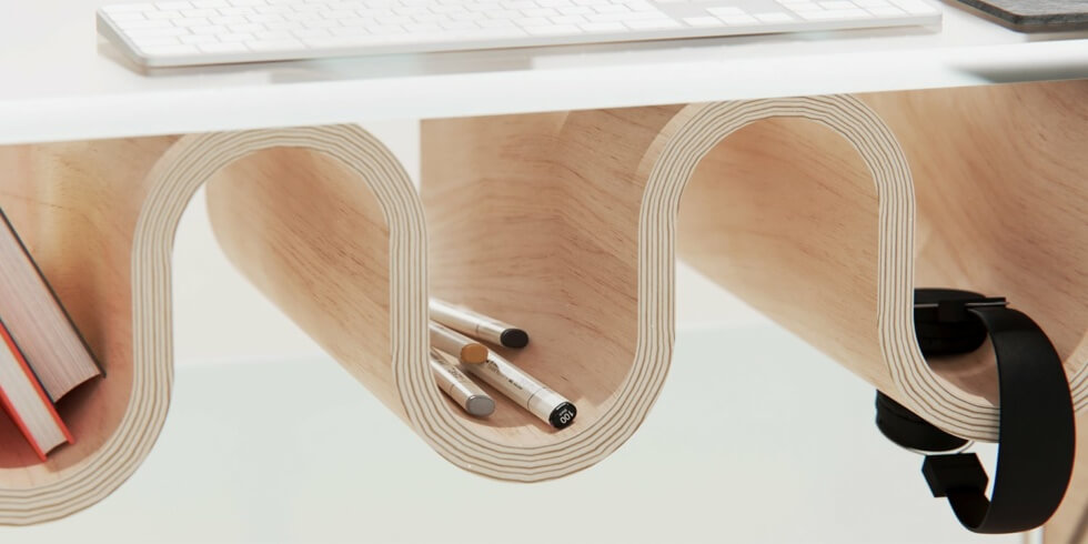 It’s a modern piece of furniture crafted from sheets of steamed and bent plywood. The plywood used offers a durable, lightweight and environmentally friendly solution to furniture production. The desk is constructed using a process that involves piecing the plywood together to render a flowing shape.