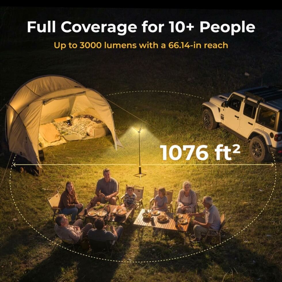 Its telescopic design, with an expandable height of up to 5.5 feet, offers versatile functionality. It easily converts between a standing light and table light in seconds. It also functions as a backpack light, SOS light, flashlight, and more. Its no-slip height lock, anti-droop light heads, and rock-solid stability ensure stable lighting every time