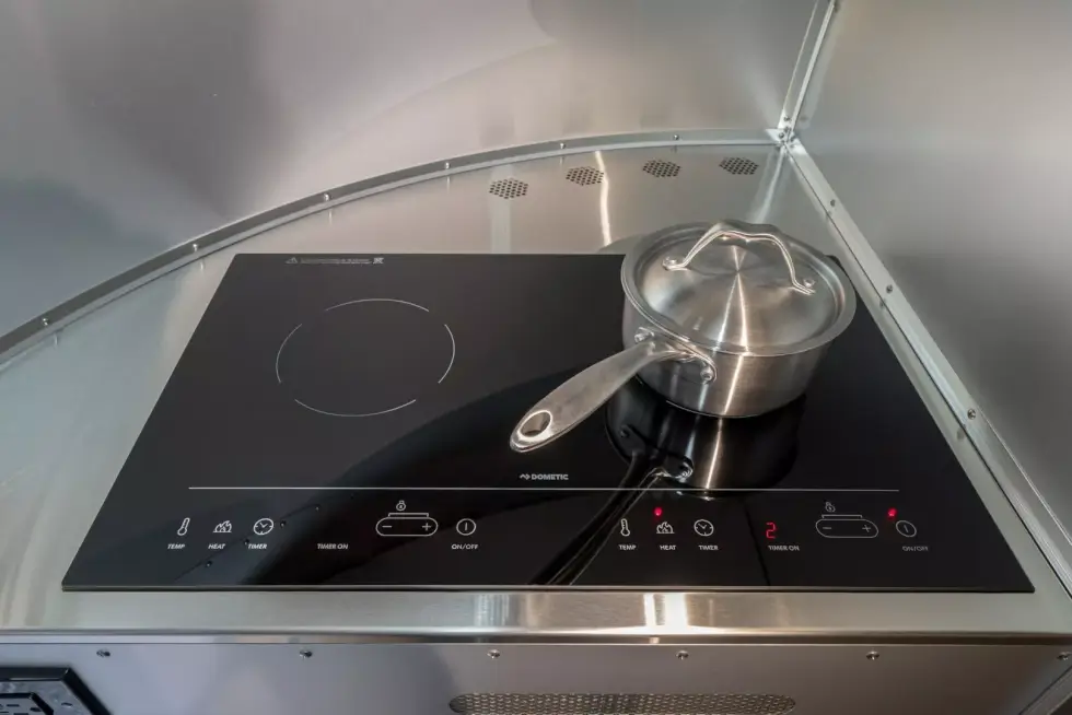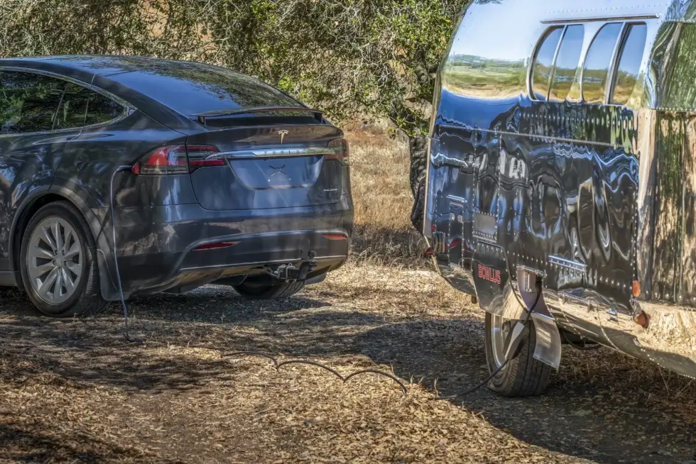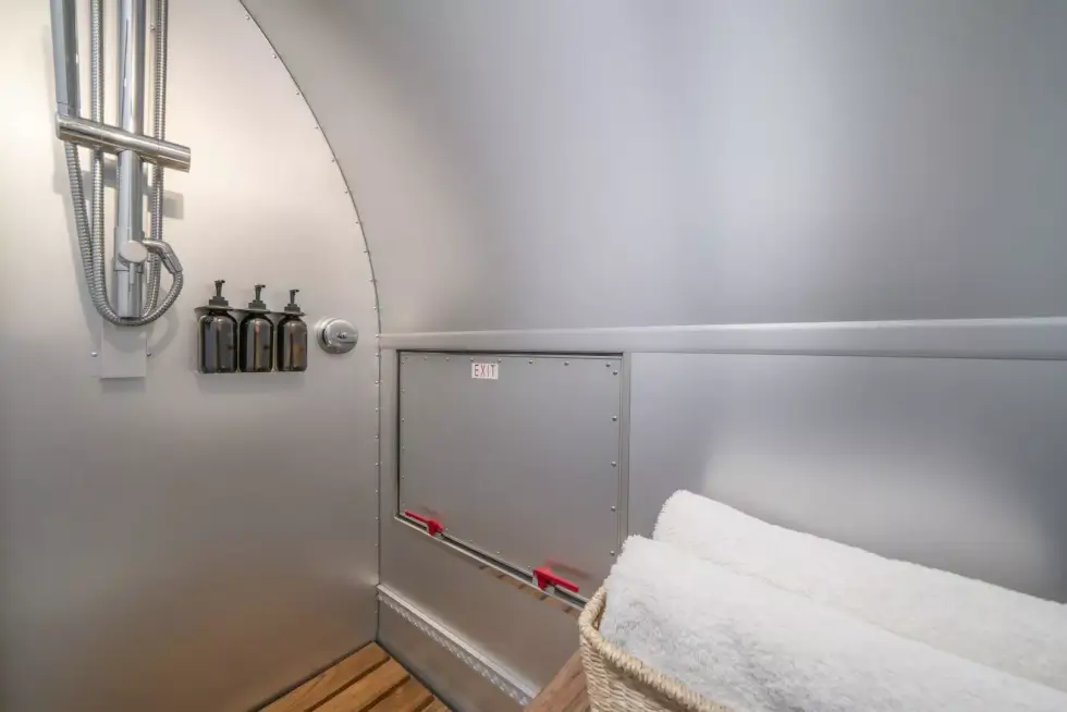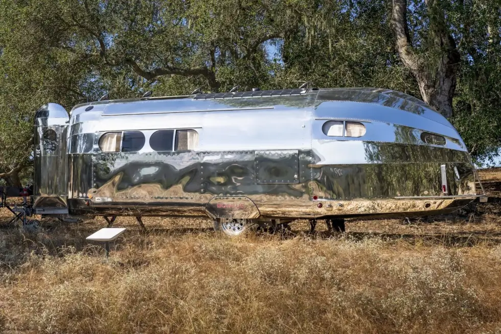 Bowlus adds to that list with its new upscale offering. First off, the shiny streamlined exterior gives off a retro vibe akin to that of Airstream travel trailers. Plus, the curvature of the front and rear sections of the Volterra makes it look like a fuselage of a classic passenger aircraft. The manufacturer claims it is the “world’s first production all-electric RV.”