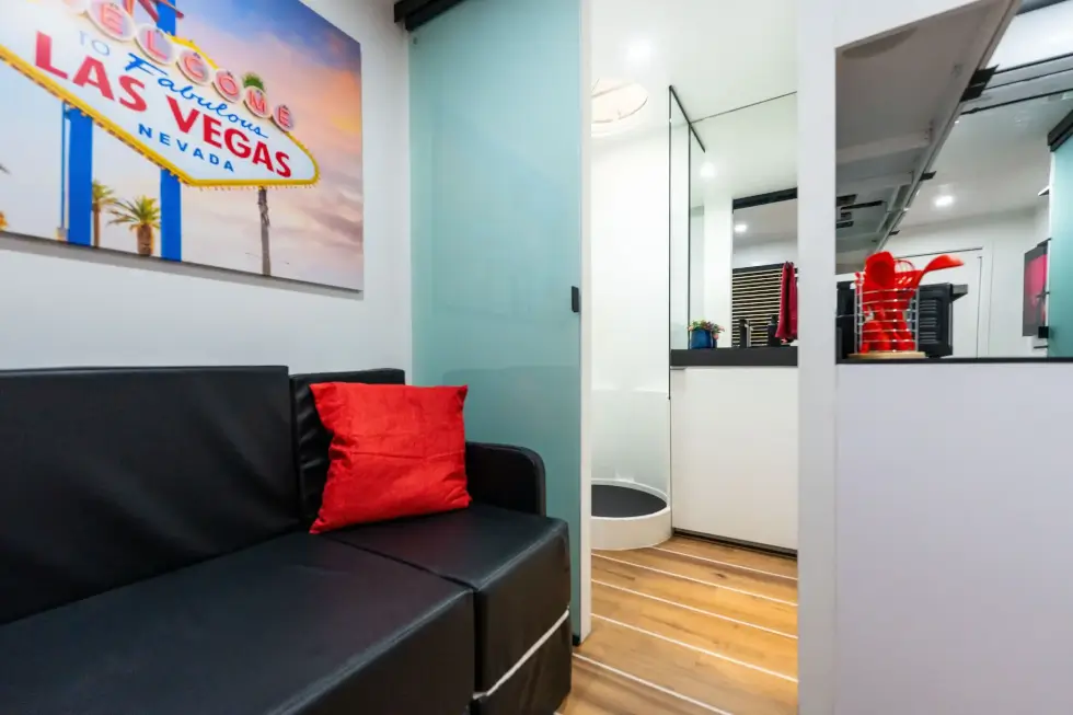 The Baby Box folds open to a measurement of around 14 feet and 9 inches long and 14 feet and one inch wide. It is also 9 feet and 3 inches high. Inside is very cozy with the space carefully and smartly organized into livable areas. There’s a living room/bedroom, a dining room, a bar/kitchen, and a bathroom. A built-in “SLS” (“Sit, Lounge, Sleep”) sofa in the living room unfolds into a bed.