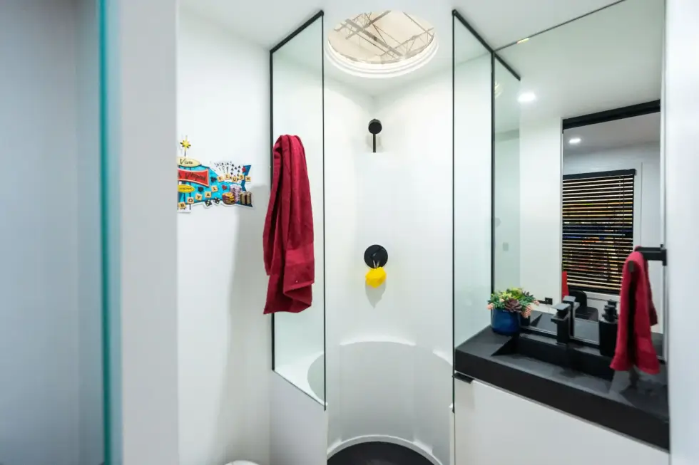Meanwhile, the kitchen has an induction cooktop and a small fridge. The bathroom has a marine-style toilet with a foot-operated flush and a classy-looking shower with glass walls and a moon roof. The Baby Box connects to power with an extension cord and water via a garden hose.
