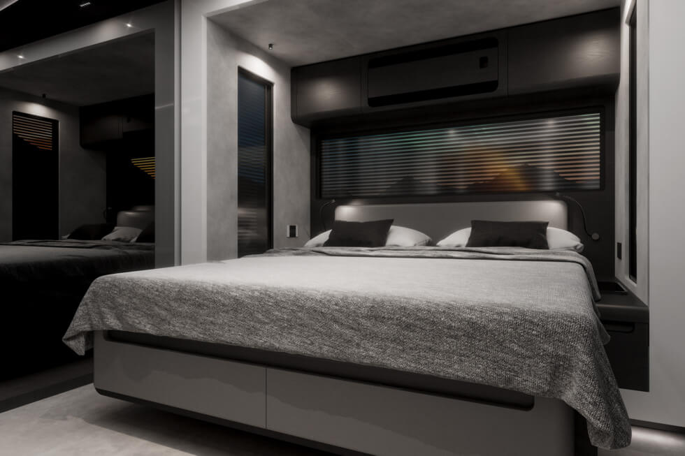 With a stellar reputation for performance and quality, clients can expect an opulent mobile suite. The three-axle platform is equipped with a 12.8-liter six-cylinder turbodiesel mill that cranks out 530 horsepower and 1,918 lb-ft of torque. Given its size and weight, the RV maxes out at 56 mph for safety reasons.