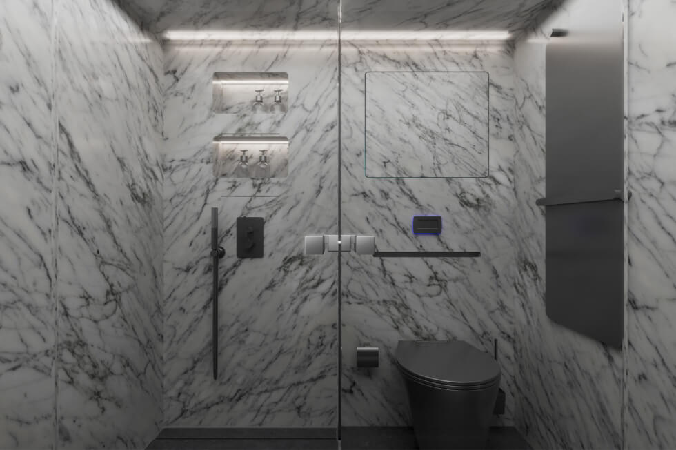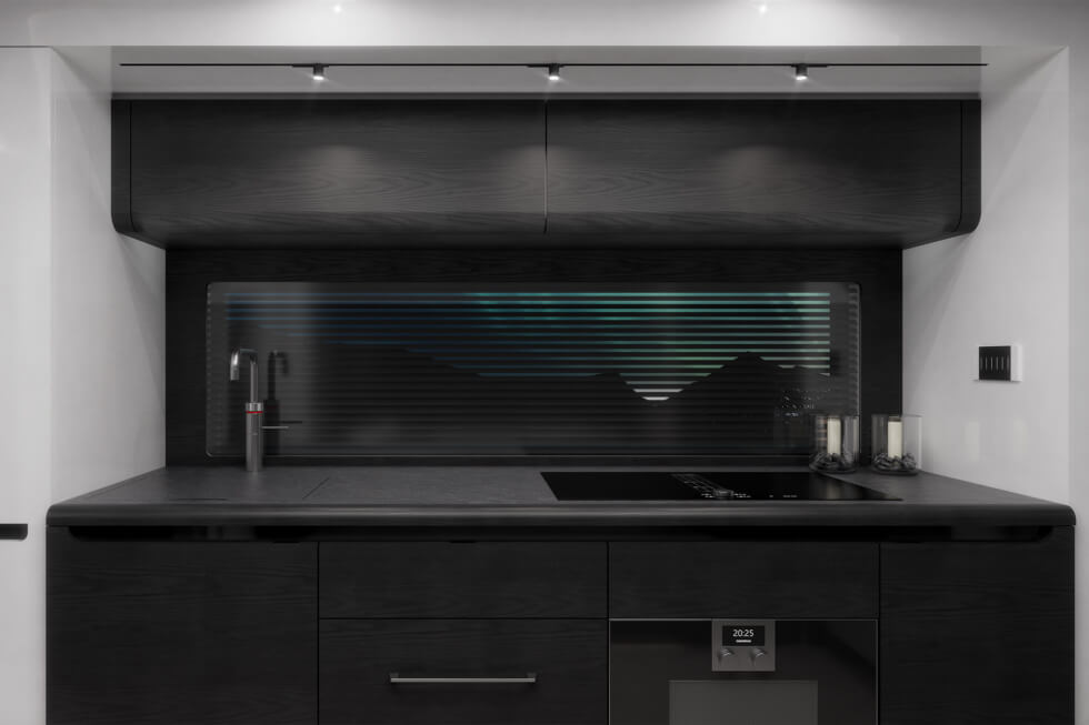 The rear wall is where you’ll find the closet. Other notable items include a 43″ smart TV, a PlayStation 5, soundbar, a Sahrai carpet, a writing desk, and a Paola Lenti chair. Elsewhere, the BIG BOY 1200 supplies power to all of the electronics via an on-board energy storage system. Eight solar panels on top of the roof harvest clean energy by day.