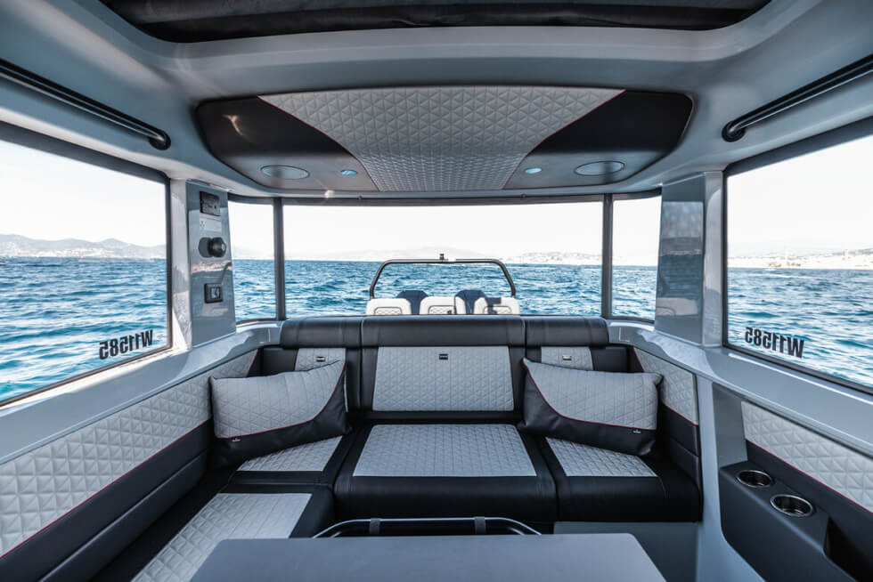 Their 900-horsepower output will easily deliver more than 55 knots with a typical cruising speed of 40 knots. As for aesthetics, we have a sharp clean hull and exterior in BRABUS Black and upholstery in BRABUS Graphite. Black chrome and Red Signature Stripes also adorn various sections and elements of the Shadow 900 XC Cross Cabin Black Ops Signature Edition.