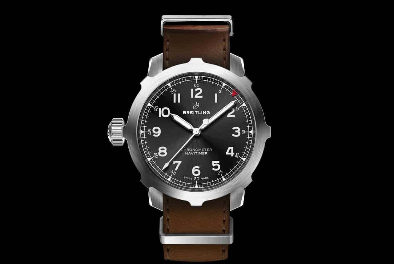 Ticking inside the Navitimer Super 8 is an automatic Manufacture Caliber B20 movement with a massive power reserve of over 70 hours. Like every Breitling, this solid watch is a COSC-certified chronometer. It’s also water-resistant to 30 meters and comes on a brown NATO leather strap, rounding off that perfect military look.