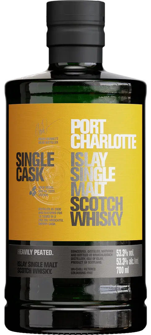 The Port Charlotte Single Cask Rock’ndaal 2025 Edition is a heavily peated 19-year-old Islay single malt scotch with a dark honey hue. It boasts a full-term maturation in a second-fill Moscatel sherry cask. As such, it touts fragrances of stoned fruit jam, toasted bread, cinder toffee, tropical fruit, sweet melon, peaches, peat smoke, orange blossom, jasmine, and oak.