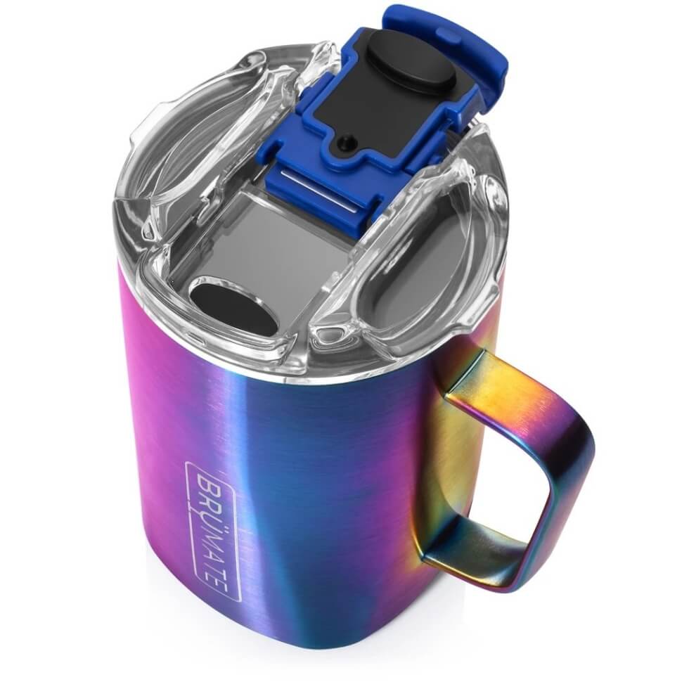The BrüMate Toddy has a 16oz capacity and comes in an easy-carry design and a compact size. It is available in an assortment of attractive combo colors including Dark Aura, Red and White, Neon Pink, Blue and Orange, Purple and Yellow, and more.