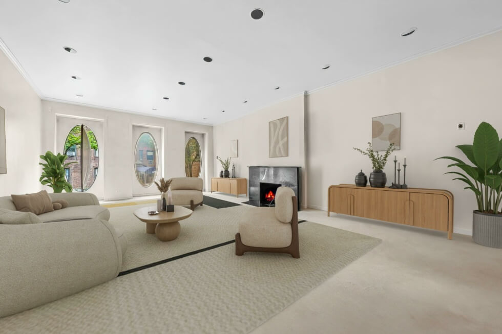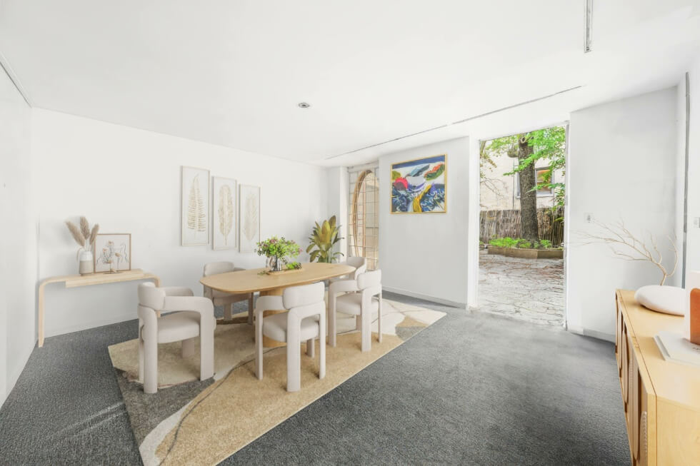 The total space spans approximately 4,736 square feet and features four bedrooms with five bathrooms. Apart from the distinctive presentation, future owners can also access a private garden for a bit of respite from the bustling city. Furthermore, lining the block are trees, evoking a connection with nature.