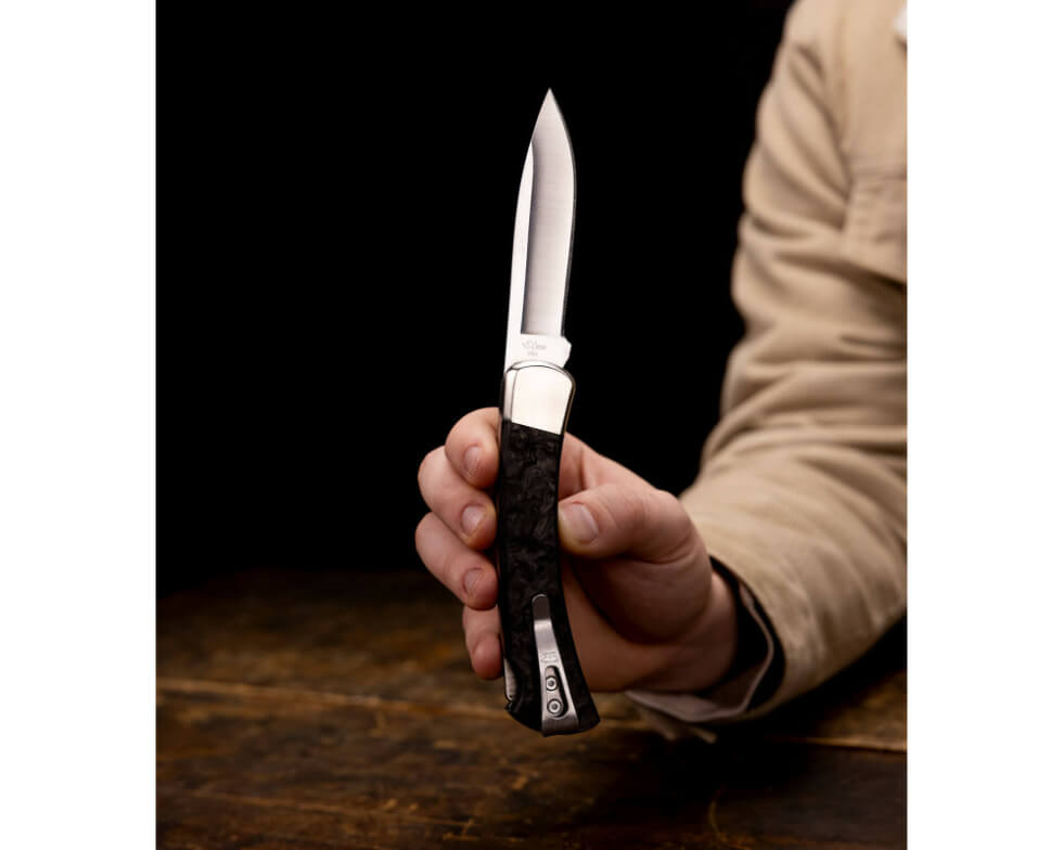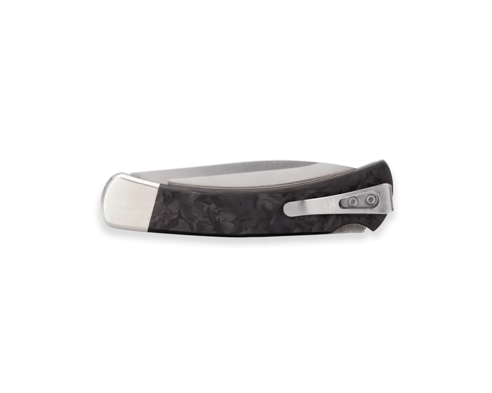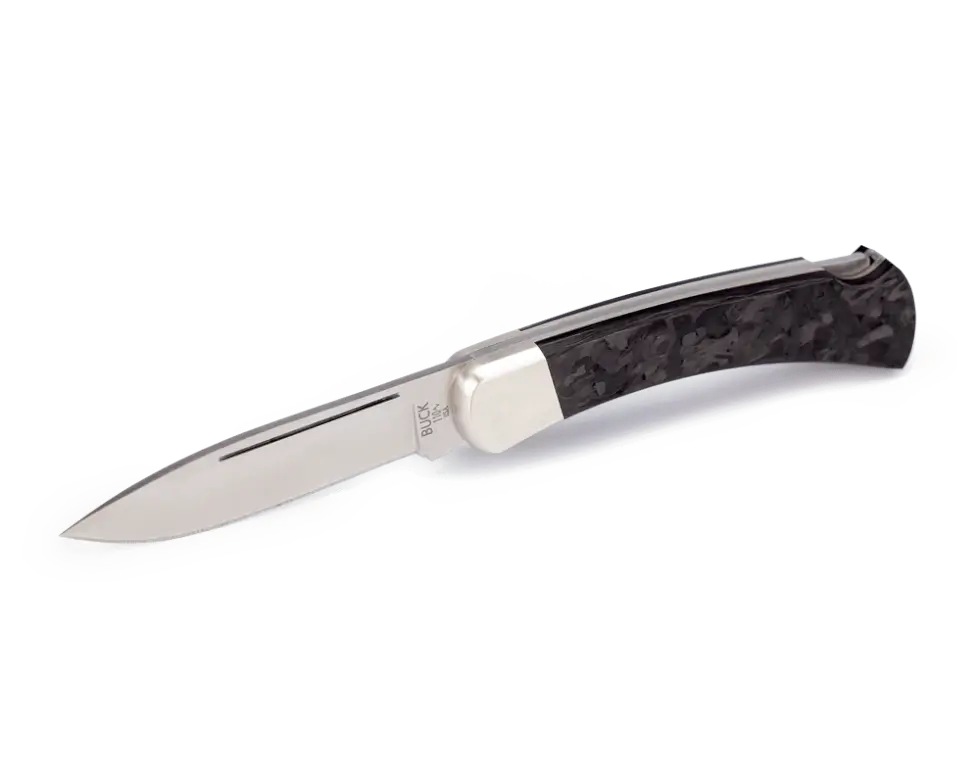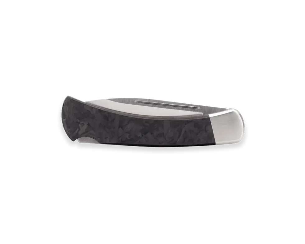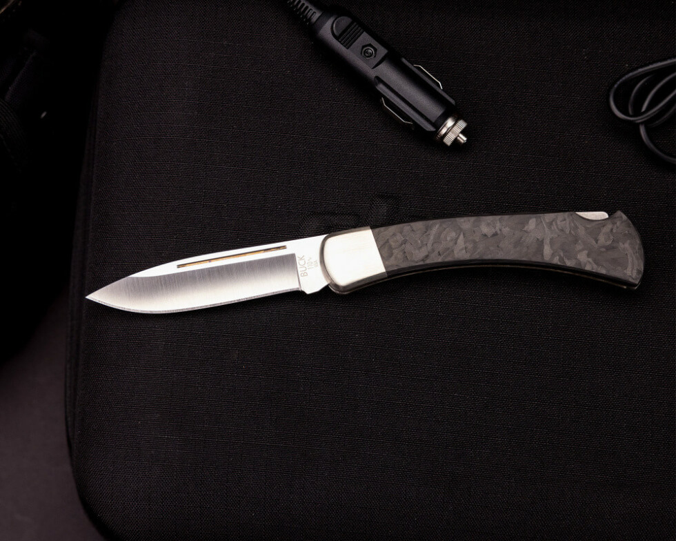 But for this month, the Buck 110 Folding Hunter gets a couple of upgrades. The scale, which traditionally comes in wood, is now a black marbled carbon fiber. Likewise, the bolster, which is usually made of brass, has been swapped with that made of silver barehead nickel.