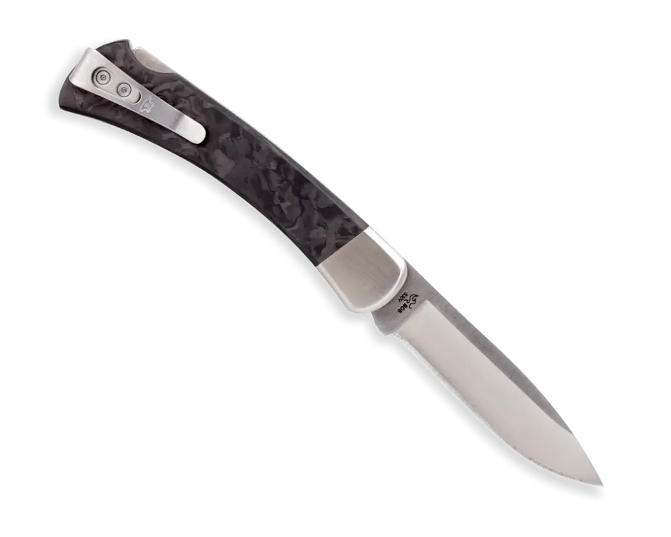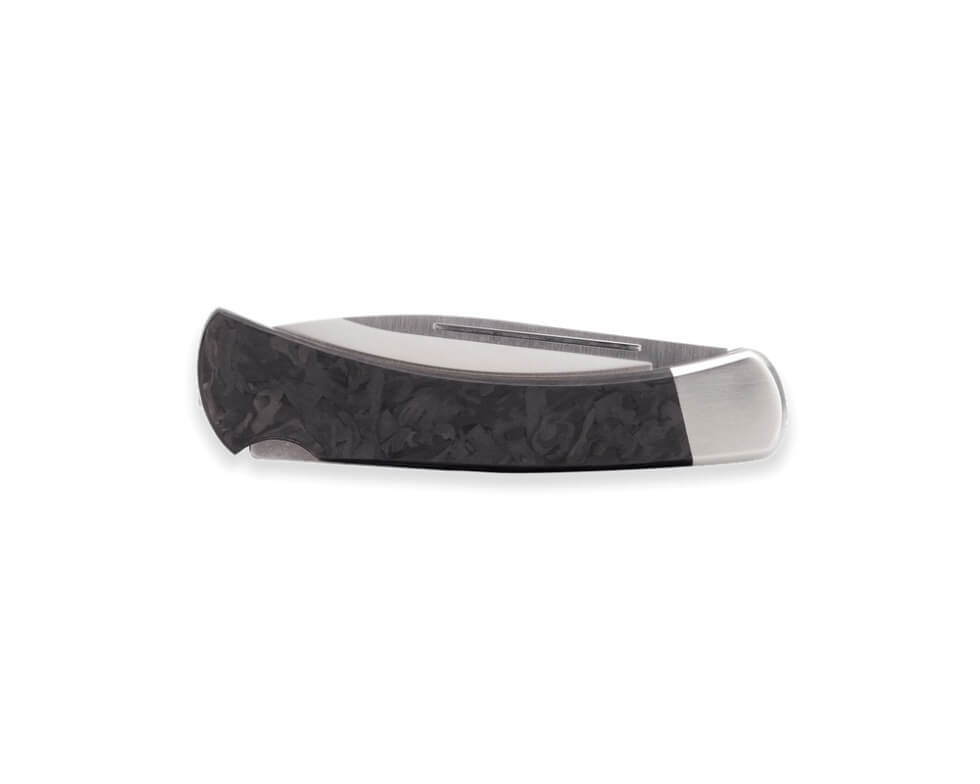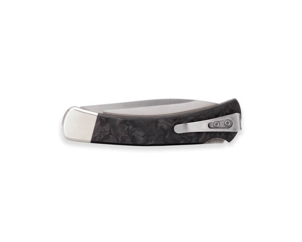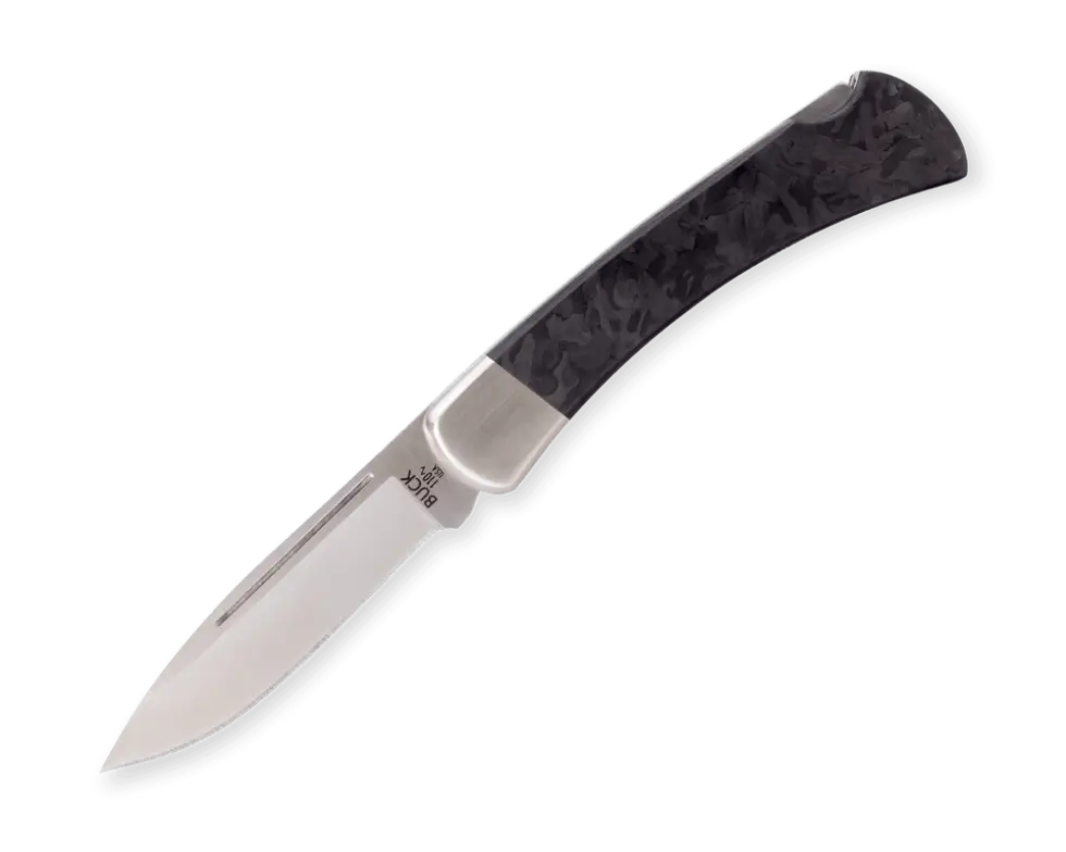 Notable changes to the limited-edition Buck 110 Hunter are the material swaps on the handle and the blade. Instead of the traditional wood, it has black marbled carbon fiber scales with a barehead nickel silver bolster instead of brass. This pairing gives it a striking and more rugged aesthetic.