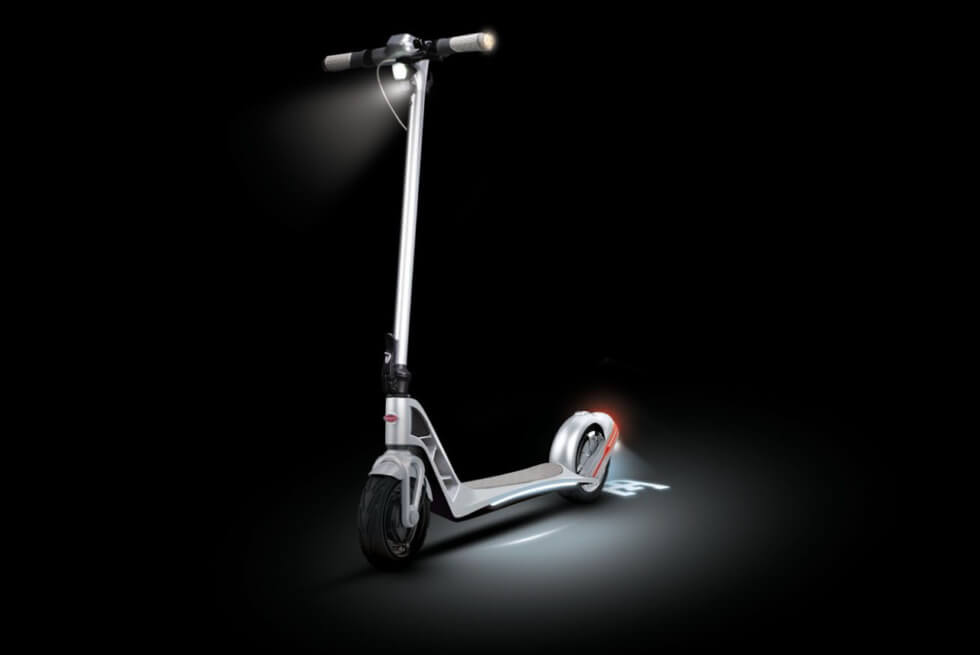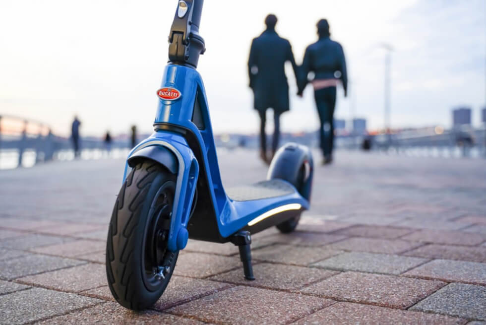 Bytech International is crafting the frame out of magnesium alloy. The stem folds down to make it easier to carry. The set of 9-inch run-flat tires keeps your ride smooth. Moreover, the Bugatti stand-up e-scooter features dual turn signals, illuminated base lights, E-ABS anti-lock brakes, and special light just below the rear mudguard that projects the “EB” logo on the ground.
