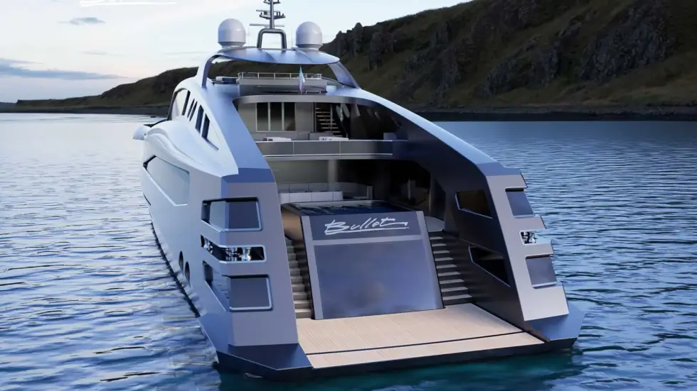 Shots of the interior are unavailable, but we know the Bullet will showcase elegance and extravagance across its 975 GT volumes. The stern of the vessel shows a swim platform with stairs that lead to a lounge with a jacuzzi. The foredeck likewise boasts amenities for socializing and entertainment.