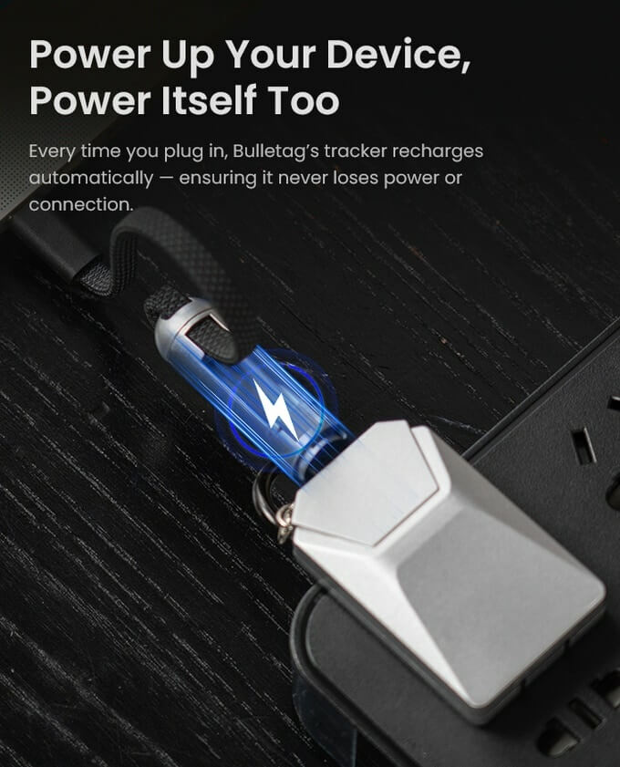 Conveniently, the tracker quietly recharges itself automatically each time you plug the Bulletag Pro to ensure it never runs out of power or connection. This means it stays powered for life, making it a sustainable choice since you don’t have to worry about battery replacements.