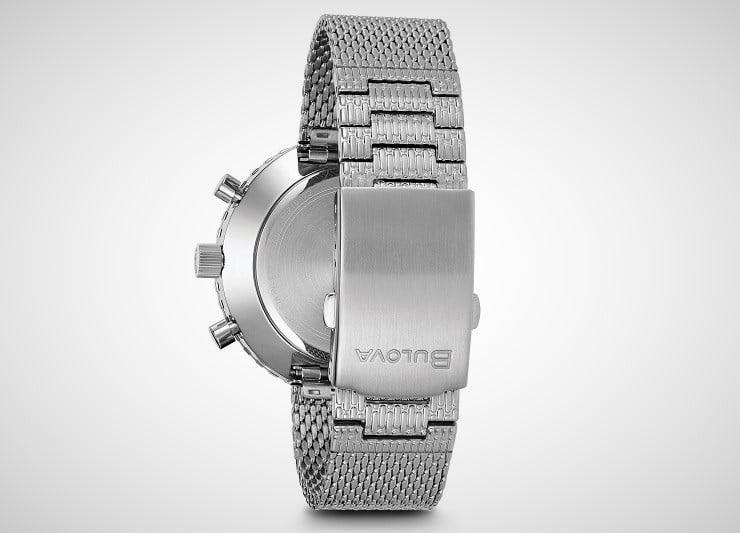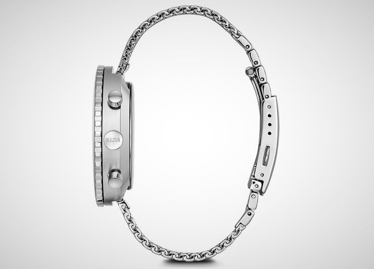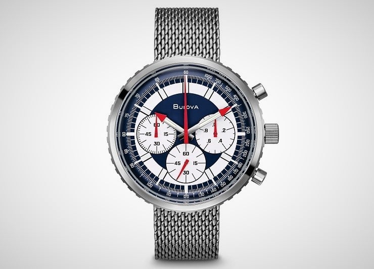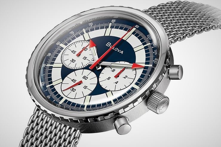 Just like the original, the new Bulova Chronograph C ($750) has a 46mm stainless steel case with coin-edge details.  Under its anti-reflective domed sapphire crystal, the dial shows three sub-complication faces for a six-handed chronograph complete with tachometer scale and hour track. The white hour & minutes hands are capped with a red arrow-tip point reminiscent of rockets and inside is a proprietary high-performance quartz movement with 262 kHz vibrational frequency.