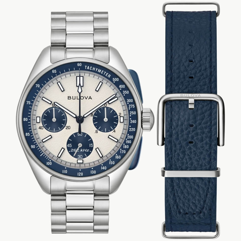 The chronograph functions run on Bulova’s NP20 High Performance Quartz movement. Personally, most of us would go for the black, but the cream/navy also has its share of fans here. The Lunar Pilot ships with a stainless steel bracelet and a leather NATO strap. At $895, it’s a classy timekeeping instrument with a fascinating origin story.