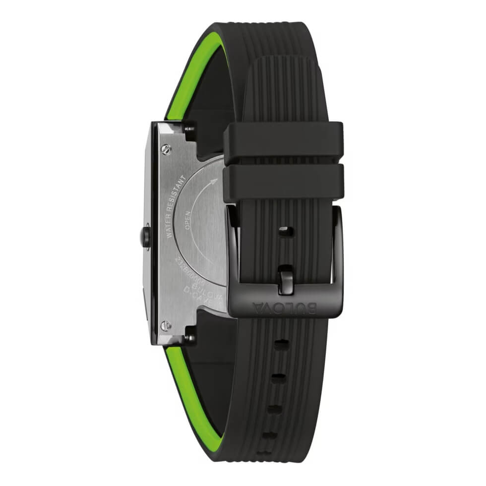 Bulova also drops the red LED display in favor of a green one, which adds to its futuristic theme (think Matrix). Protecting the display is a mineral crystal for reliable impact and shatter resistance. The only tonal deviations from the otherwise all-black theme are the stainless steel case back and green trims on the silicone rubber strap.
