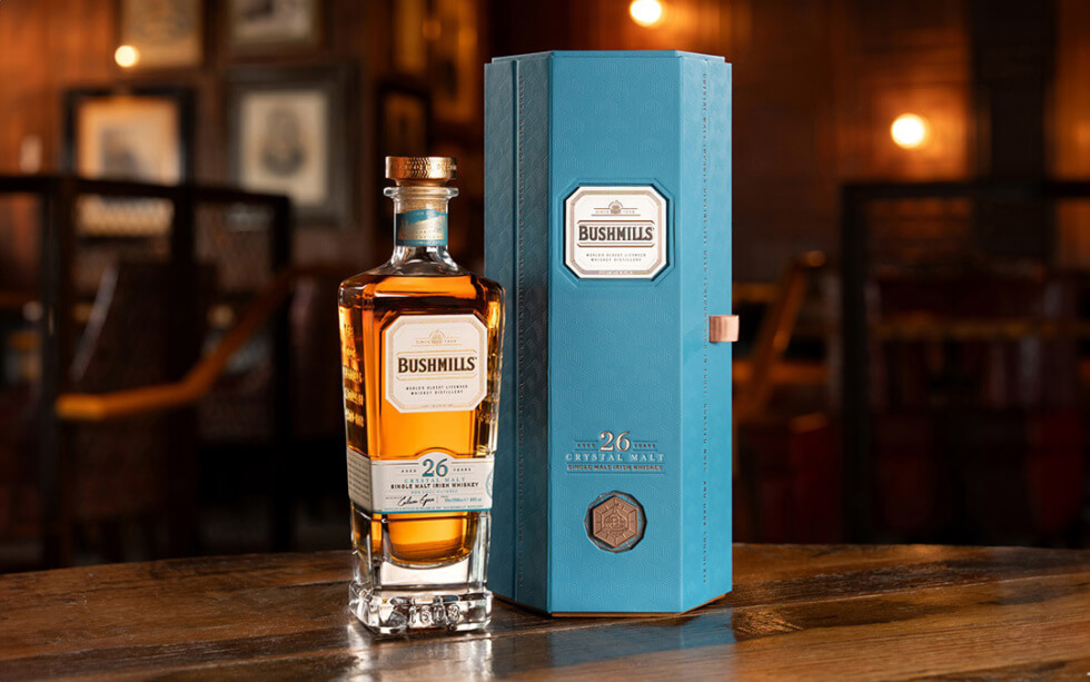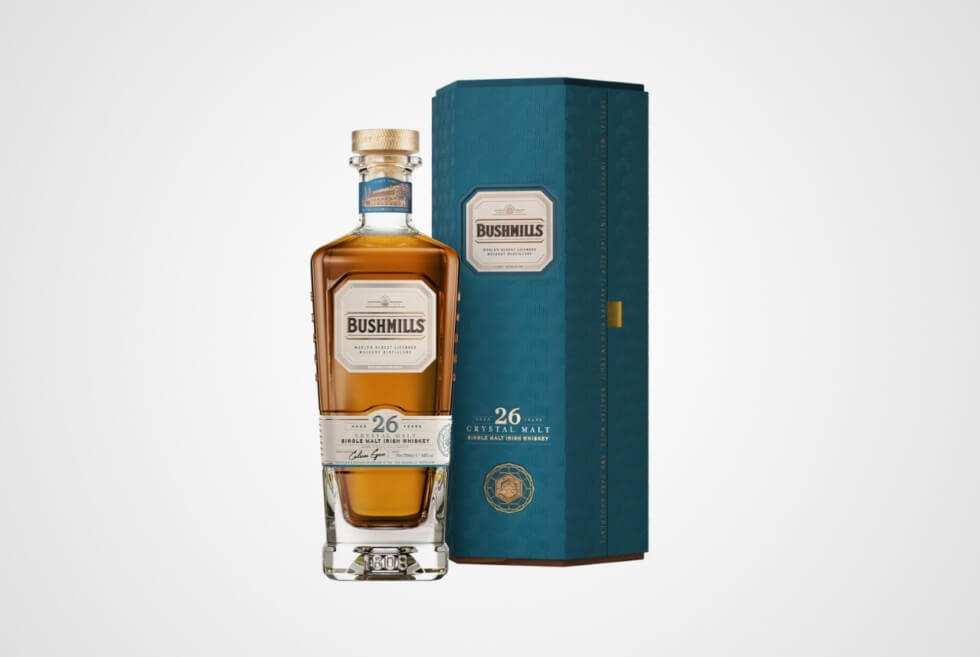 “Our Bushmills 26 Year Old Crystal Malt is a true innovation in rare Irish single malt. Before they are casked in oak, which traditionally gives most whiskeys their key notes, this exquisite single malt gains a sublime punch of flavour pre-distillation,” reads the official description.