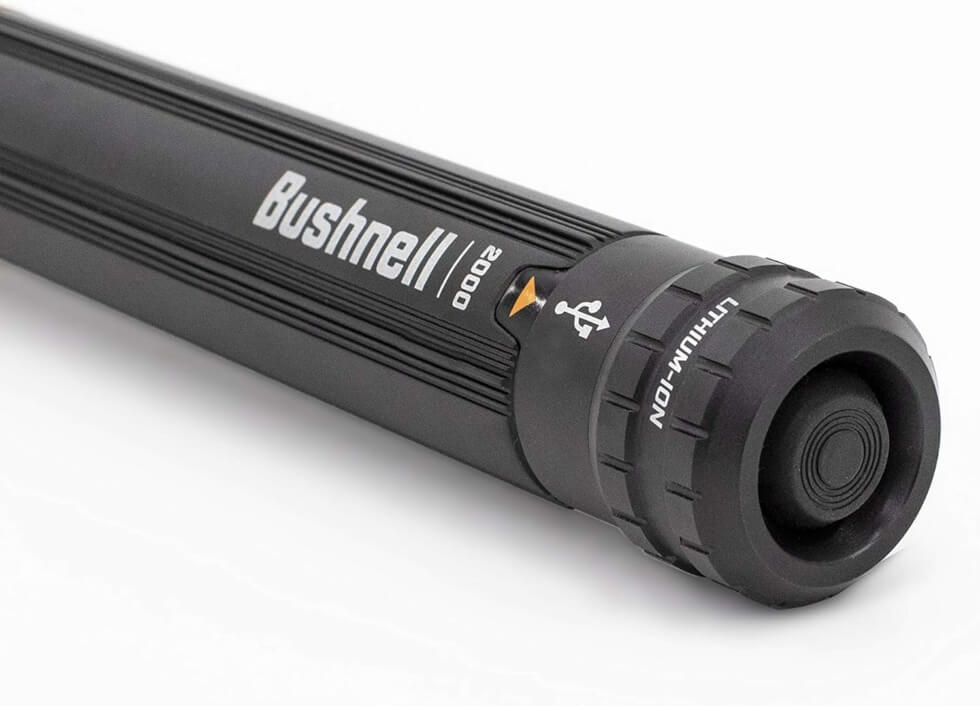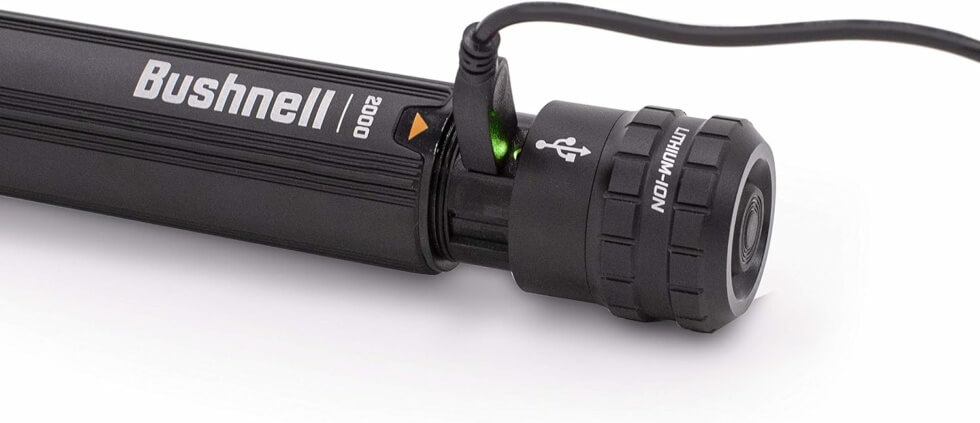 The Bushnell 2000 Lumen Rechargeable Flashlight features a long elongated shell made from anodized aluminum. It runs on dual rechargeable 18650 batteries, which is credited for its long runtime even under high mode. It recharges via a built-in USB-C charging port.