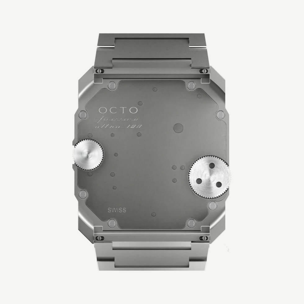 The Octo Finissimo – as the name hints at – comes in a 40 mm octagonal titanium case. We like the muted tone from the sandblasted matte finish on all surfaces including the 1.50 mm titanium bracelet. You’ll barely notice it, but BVLGARI still manages to fit a 0.30 mm sapphire crystal over everything.