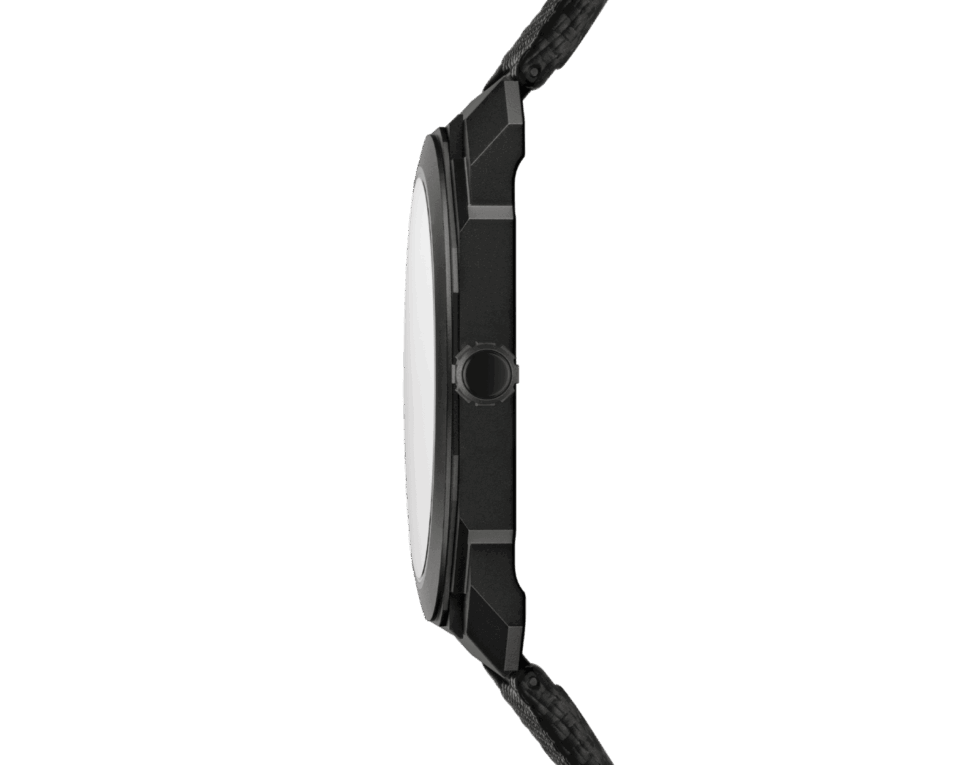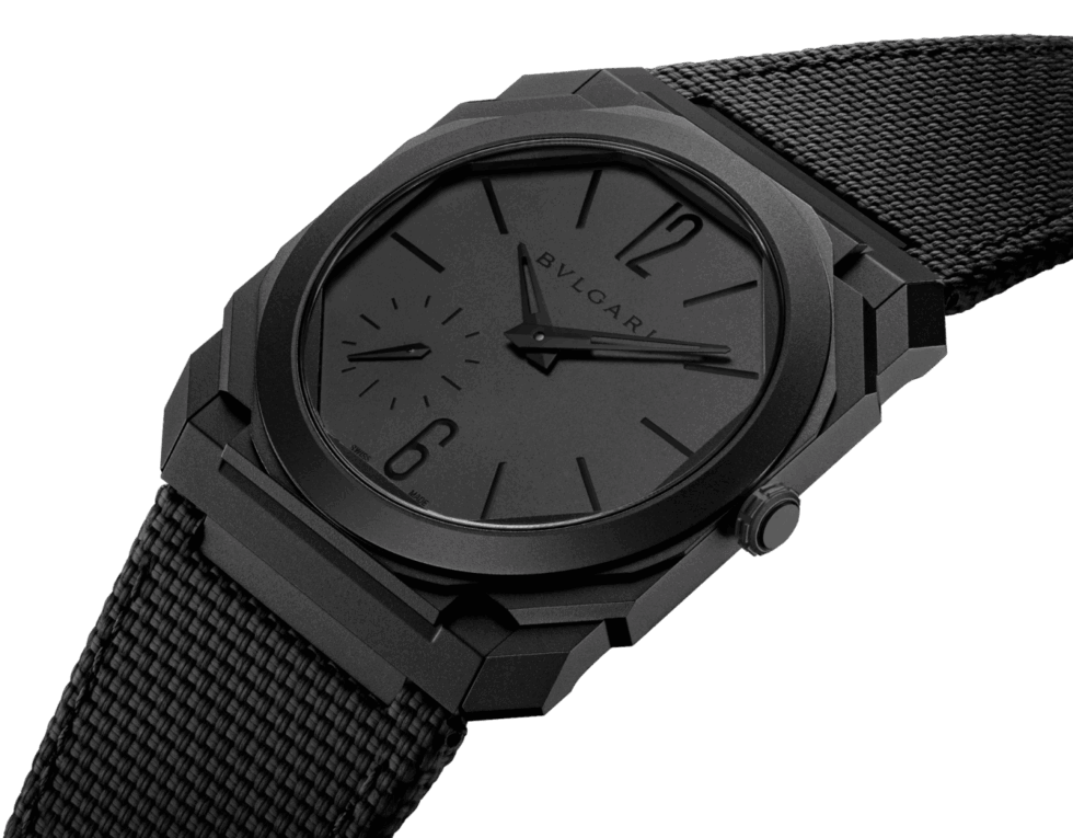A fixed bezel frames a matte black dial with glossy black baton hour markers, Arabic numeral hour markers, and hands. BVLGARI pairs this murdered-out Octo Finissimo Automatic with a fabric-textured rubber strap. A black DLC titanium pin buckle closure system completes this elegant ensemble. No need to rush because sources confirm the reference is not a limited-edition affair.