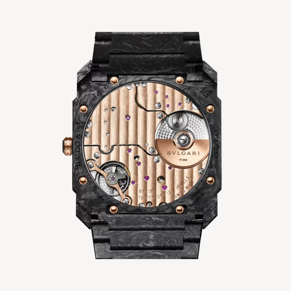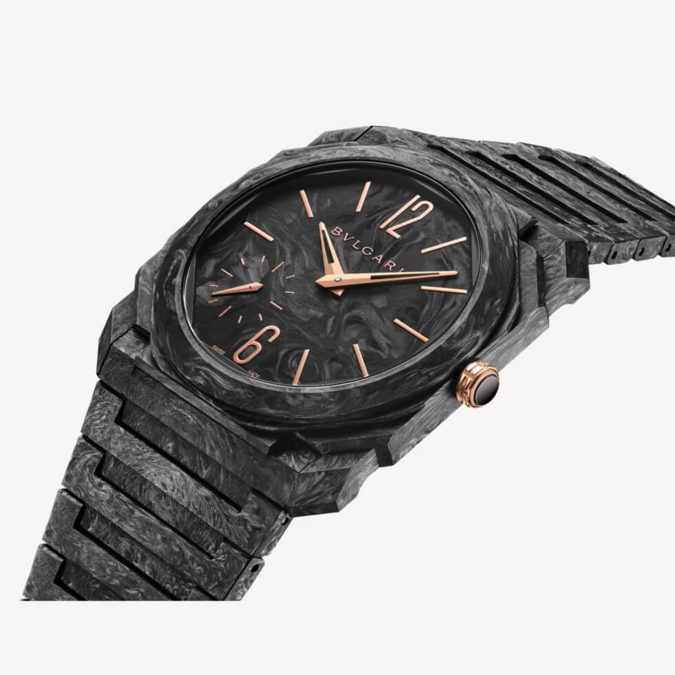 BLVGARI is known for small yet outstanding details such as the rose gold crown topped by a black ceramic insert. The Octo Finissimo CarbonGold Automatic is powered by a Caliber BVL 138, while the Octo Finissimo CarbonGold Perpetual Calendar runs on a Caliber BVL 305. These are self-winding movements with a 60-hour power reserve.