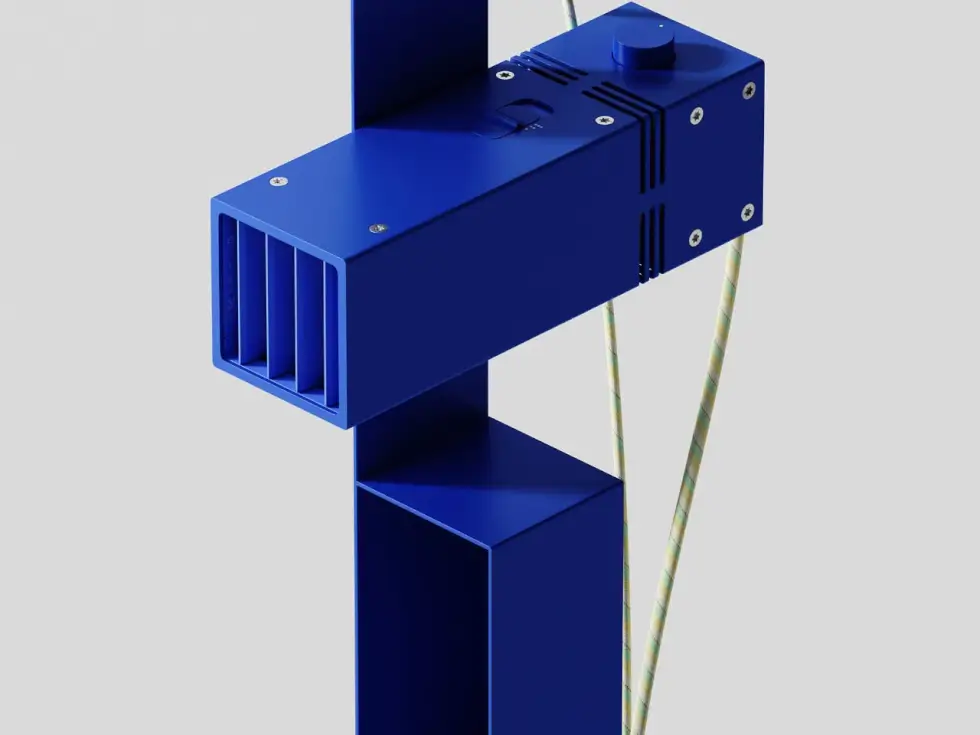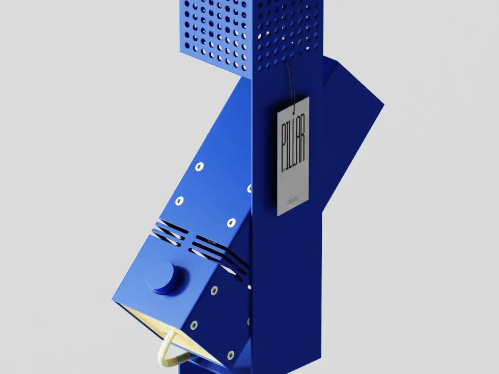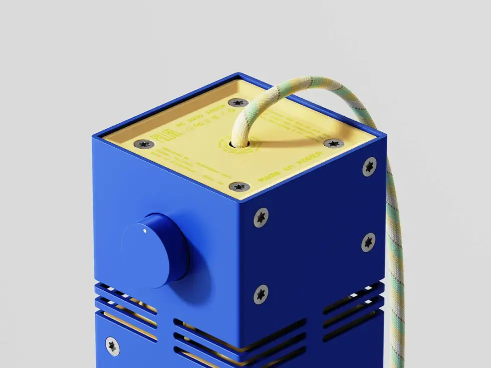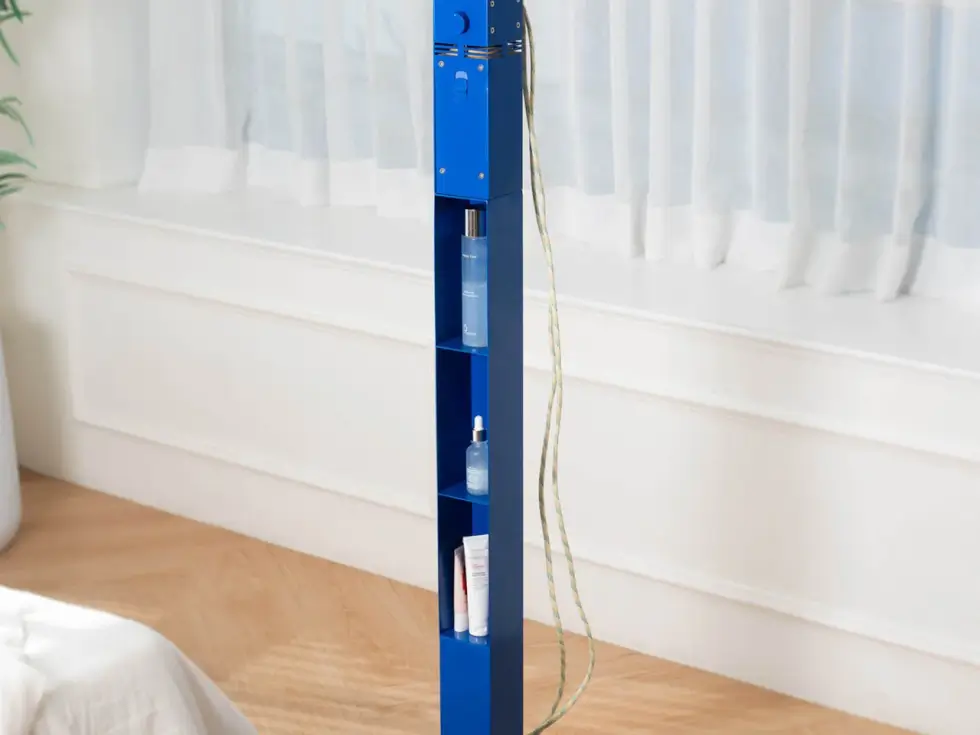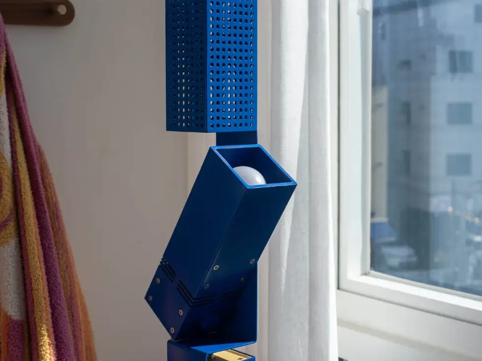 While one cuboid houses the hair dryer the other has a built-in E26 socket for a swivel lamp. The steel frame features holes that offer ambient lighting with the cuboid for the lamp closed and not swiveled out. The cuboids are magnetic so you can swap their locations according to your needs.