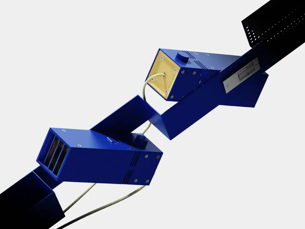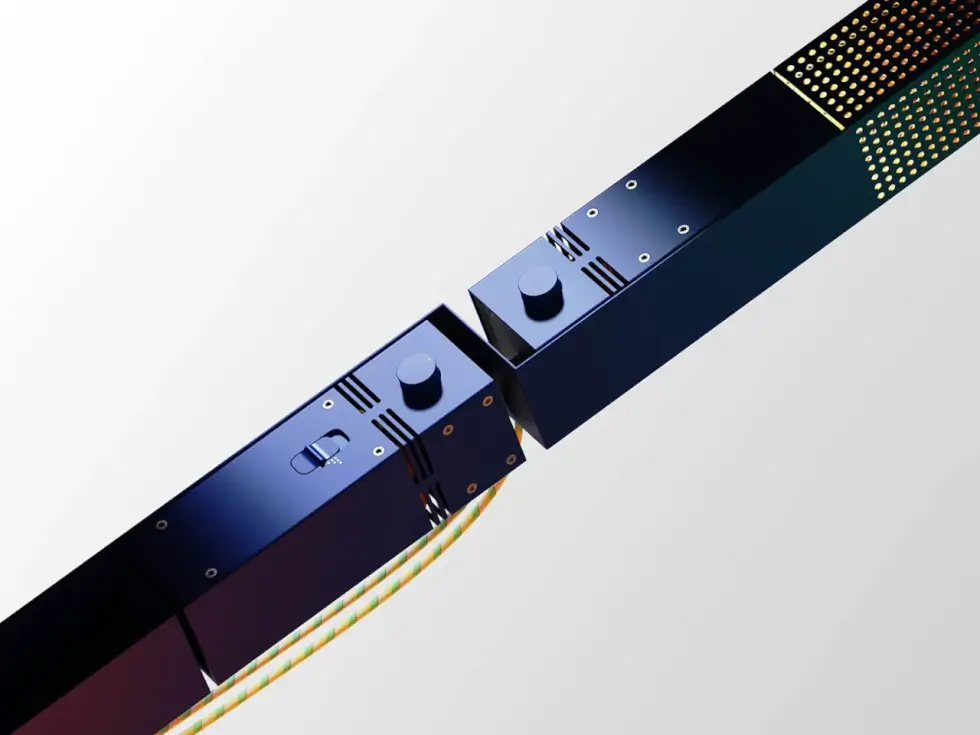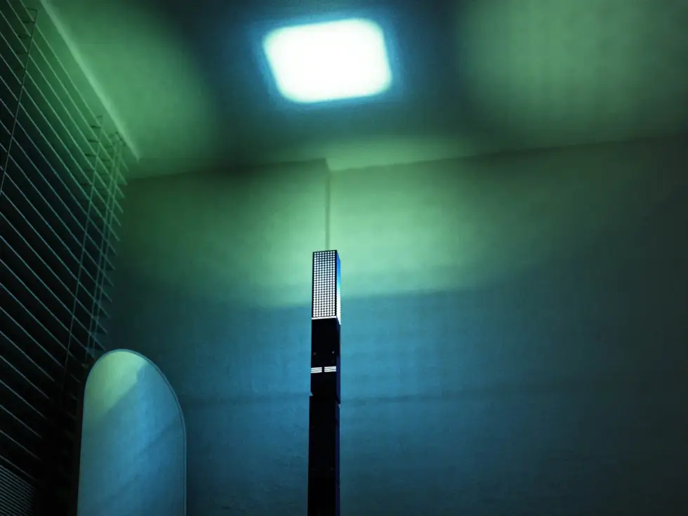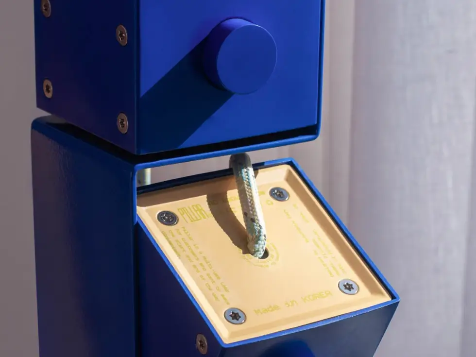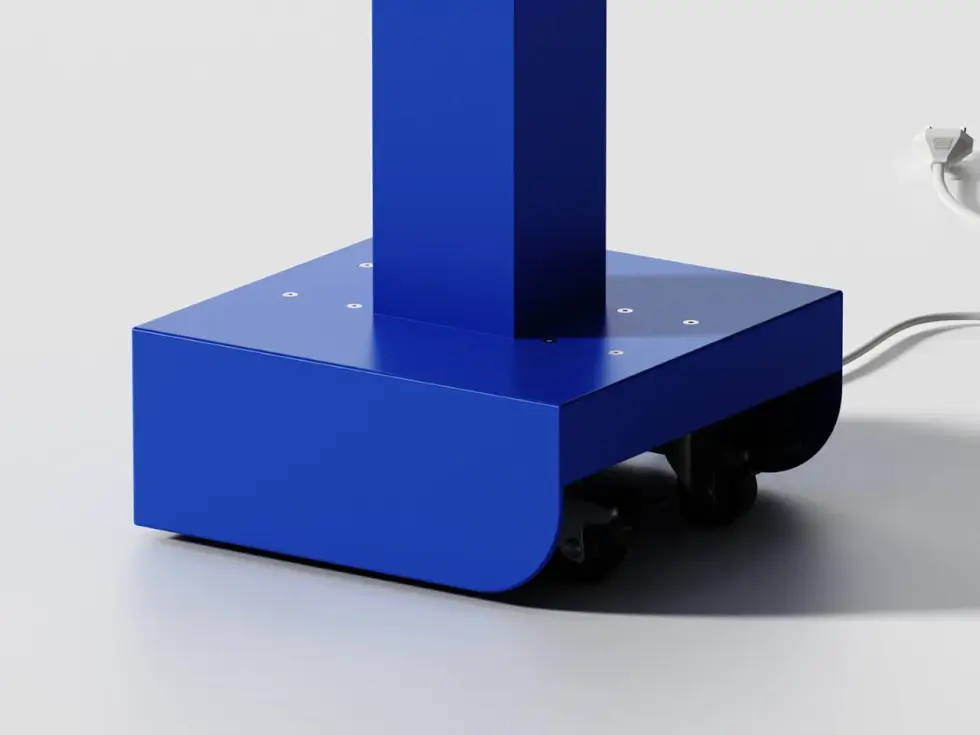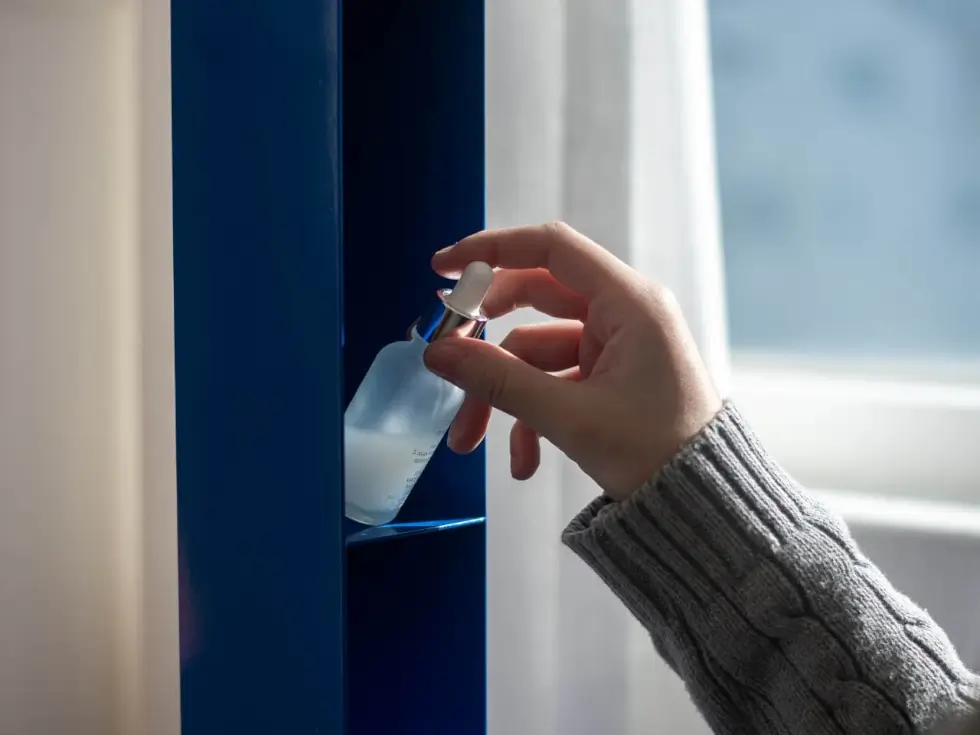 While one cuboid houses the hair dryer the other has a built-in E26 socket for a swivel lamp. The steel frame features holes that offer ambient lighting with the cuboid for the lamp closed and not swiveled out. The cuboids are magnetic so you can swap their locations according to your needs.
