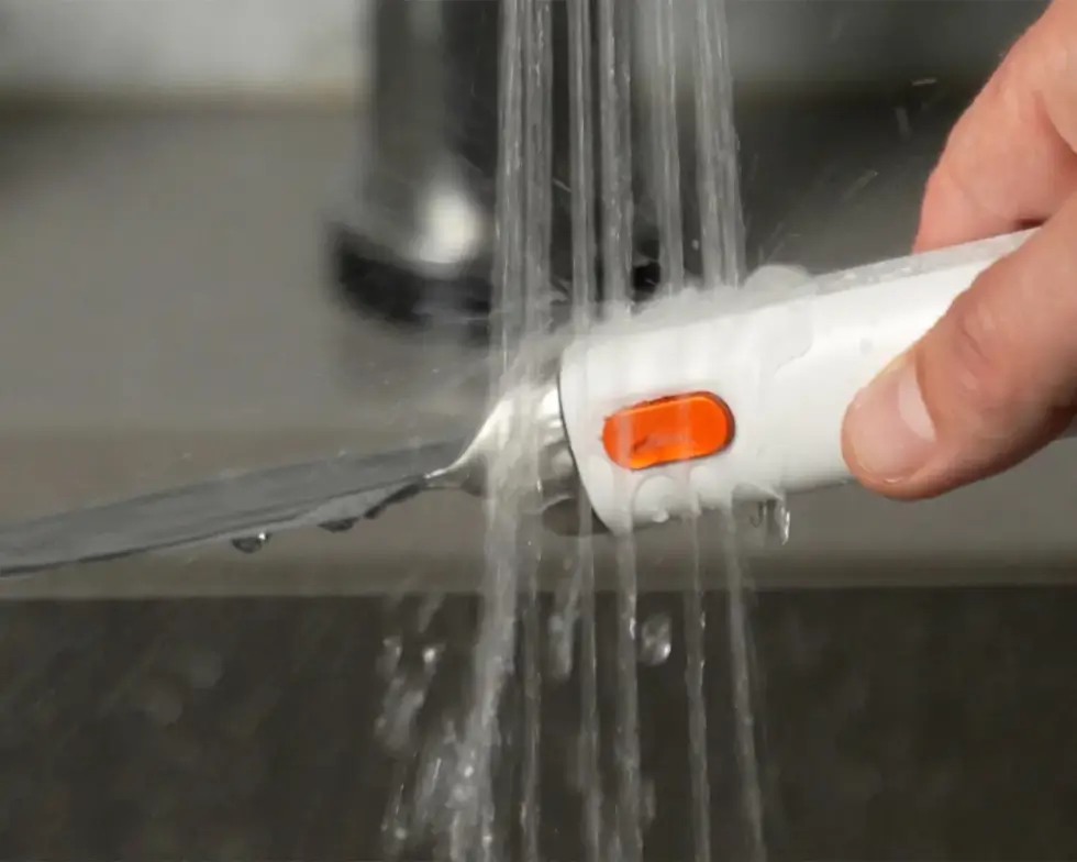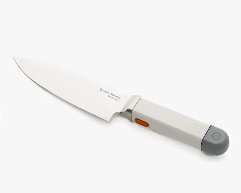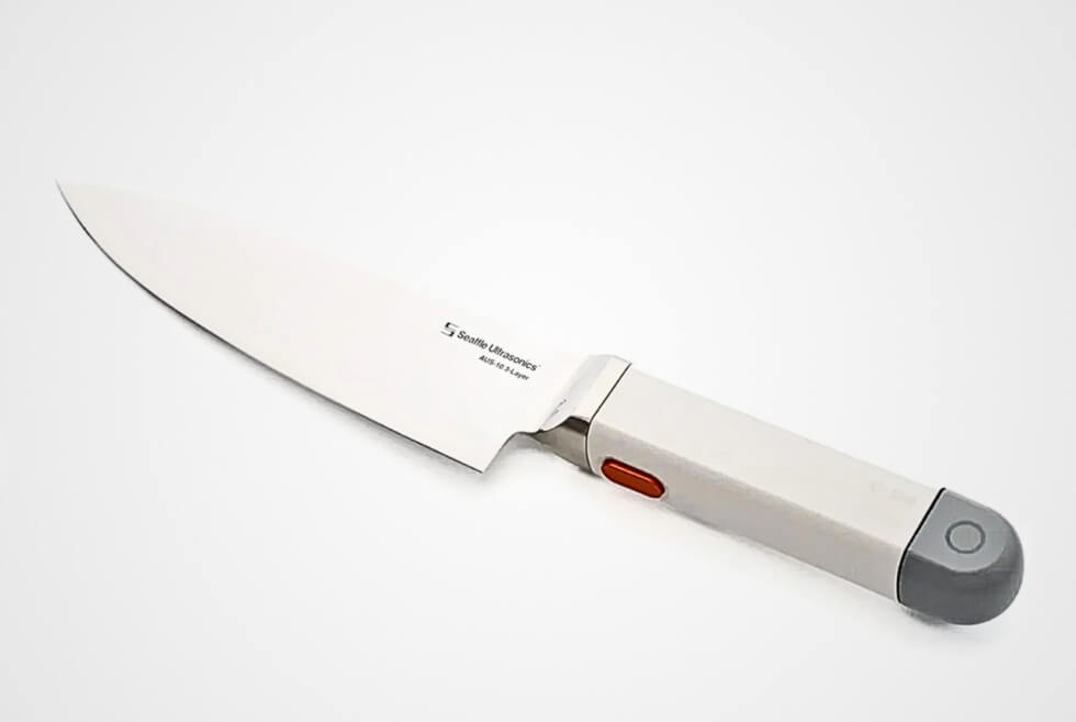 The IP68-rated water-resistant handle houses a precision device that triggers the blade to vibrate at a speed of 40,000 times per second. Seattle Ultrasonics says the knife cuts with up to 50 percent less effort than traditional chef knives. It also provides cleaner, faster, and easier cuts. Moreover, with less residue sticking on the blade, cleanup is also easier.