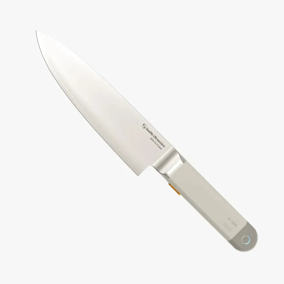 Seattle Ultrasonics’ C-200 Ultrasonic Chef Knife makes slicing delicate and sticky food elegantly effortless. That’s saying something considering the difficult textures of these foods require special blades. This knife employs an unconventional design approach, utilizing the power of high-frequency vibrations to ensure precise and clean cuts of any food or ingredient.