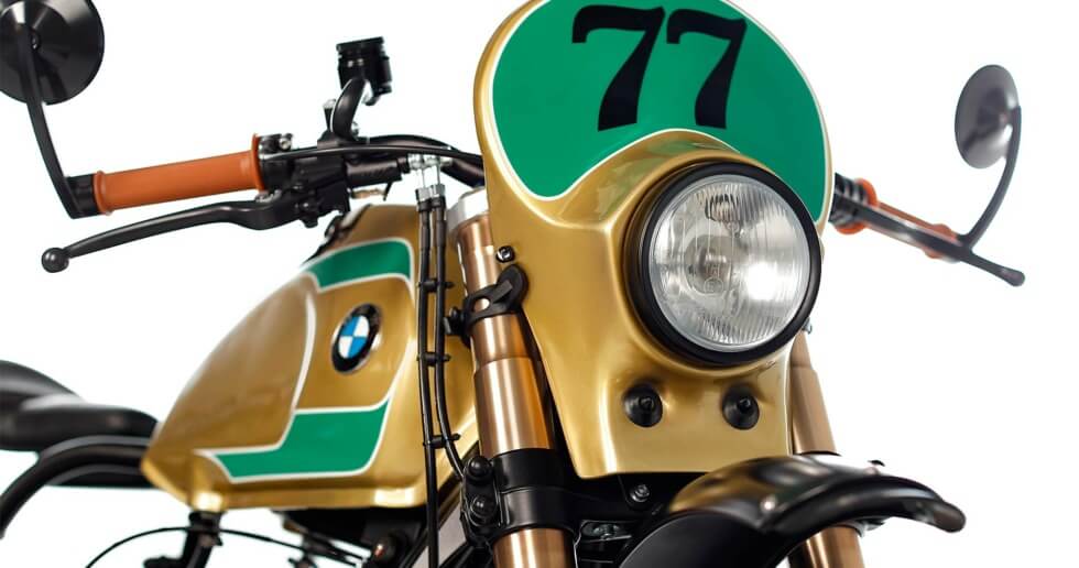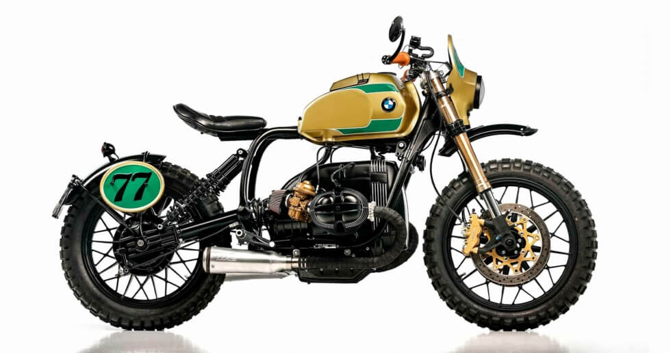 The vintage aesthetic on this custom moto from Café Racer Dream draws inspiration from the above-mentioned bike. The workshop is overhauling a 1983 BMW R 80 RT and turning it into an off-road-ready tribute – the #CRD128. We’re loving the two-tone gold/black with green livery on this moto.