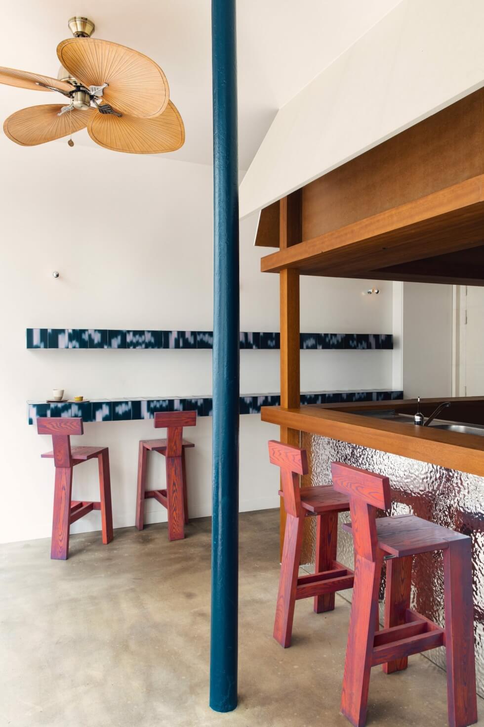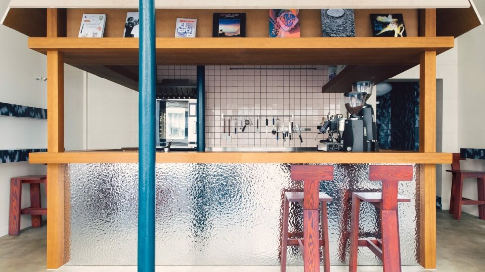 Other aesthetic influences include a cozy that resembles a South Korean bathhouse. Uchronia then adds flower cushions as whimsical touches. The same Palet tiles as the exterior cover this section of Cafe Shin and its shelves. Finally. the owners are South Korean pastry chef Shin Eun Jung and French chef Julien Sebbag.