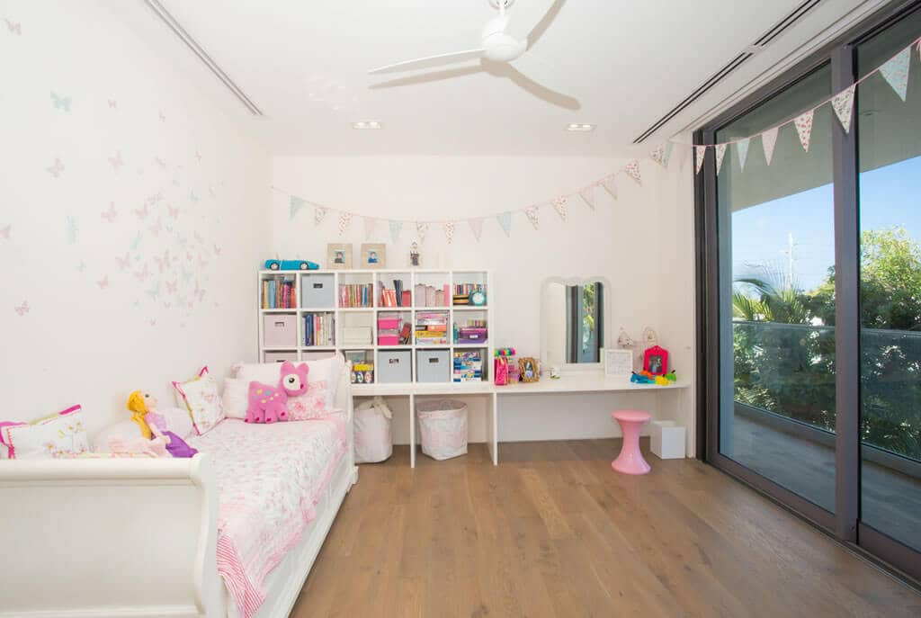 The upper floor holds three bedrooms with en-suite baths and private balconies, but the most dramatic space here is that of the master bedroom, which boasts 180-degree views of the blue Caribbean Sea. The award-winning residence was developed in collaboration with Nicolas Tye Architects (based in the UK) and John Doak Architecture (local firm).