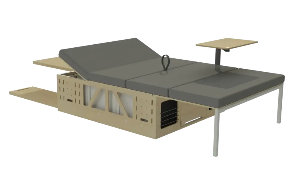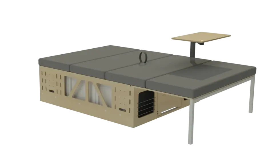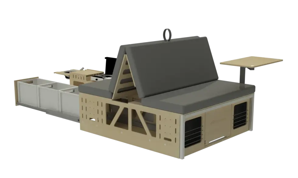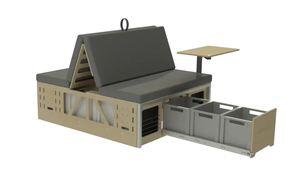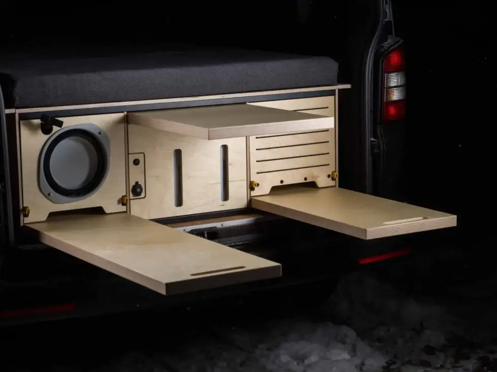 CampBoks also outfits the assembly with two 12-liter water tanks and an automatic pump. A shower attachment and its 9.8-foot hose make cleanup easy. To the right is another pull-out holding three Euro boxes for storage. At the end of the day, a convertible sitting and sleeping mattress can easily accommodate up to two adults.