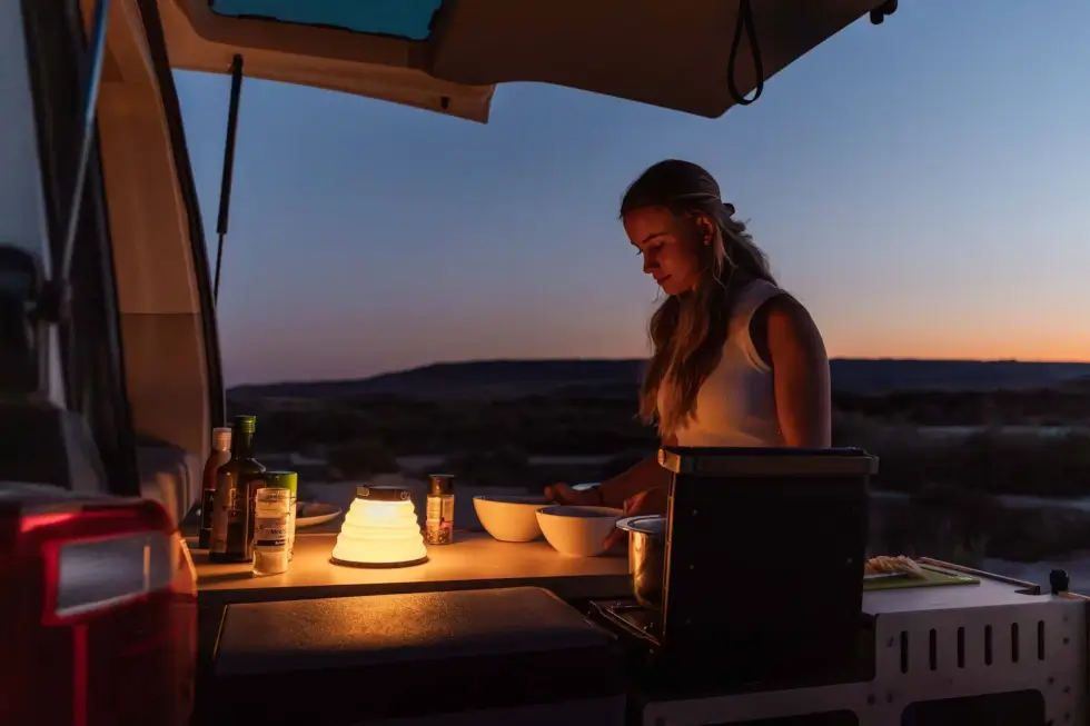 Meal preparation is a breeze with its kitchen pull-out located to the left. The setup includes a one-flame cooker which uses 230-gram screw gas cartridges and a 15-liter compressor cool box for ingredients, beverages, and other food items. Two cantilevered benches and a table can be extended when eating or drinking.
