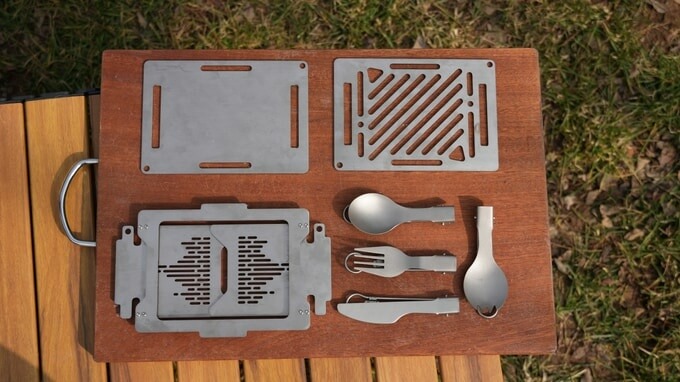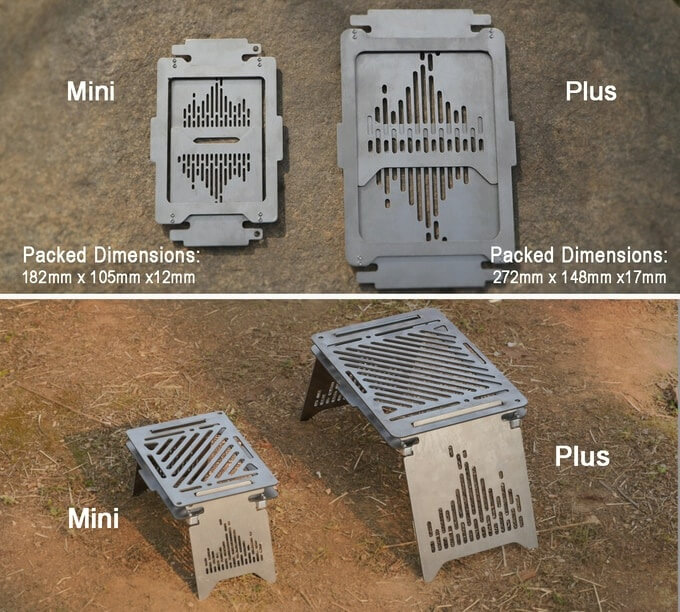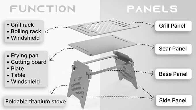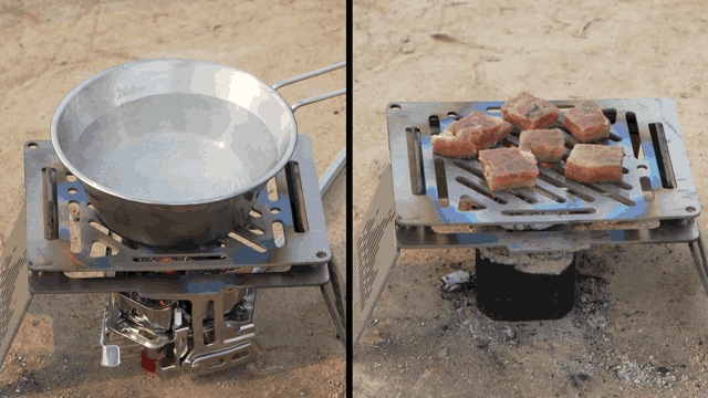 The grill panel doubles as a grill rack, windshield, and boiling rack or a stable support for your pot or pan. Then you can fry foods on the sear panel, which also doubles as a table, chopping board, or plate. Remove both panels and you have the bases left to provide stable support should you go for BBQ or use a pot or pan directly over fire.
