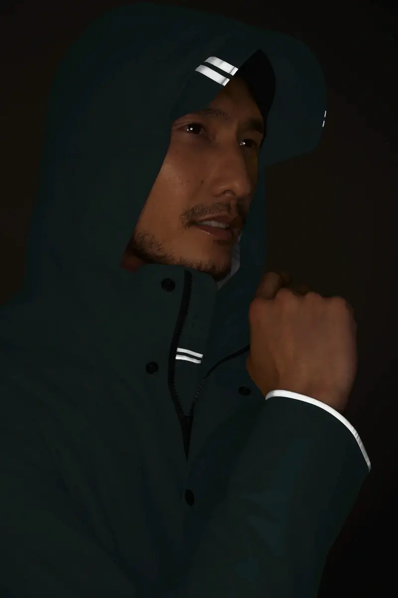 Meanwhile, articulated sleeves and underarm gussets allow for a wide range of motion. The Nanaimo Rain Jacket has a placket with snap closures over a two-way zipper that unzips from the bottom for added range of motion or ventilation. The storm flap underneath the zipper has reflective details and laser-cut perforations for added airflow.
