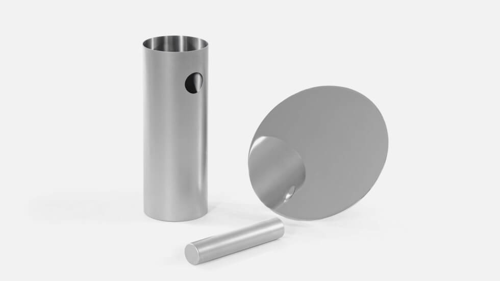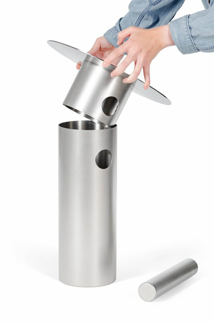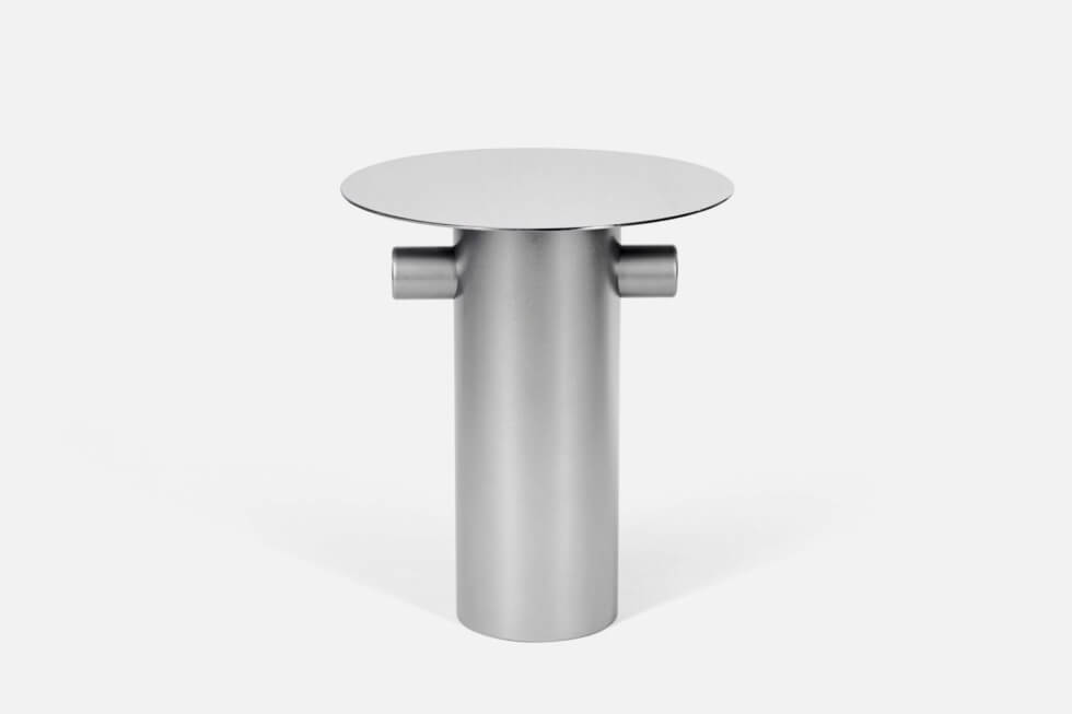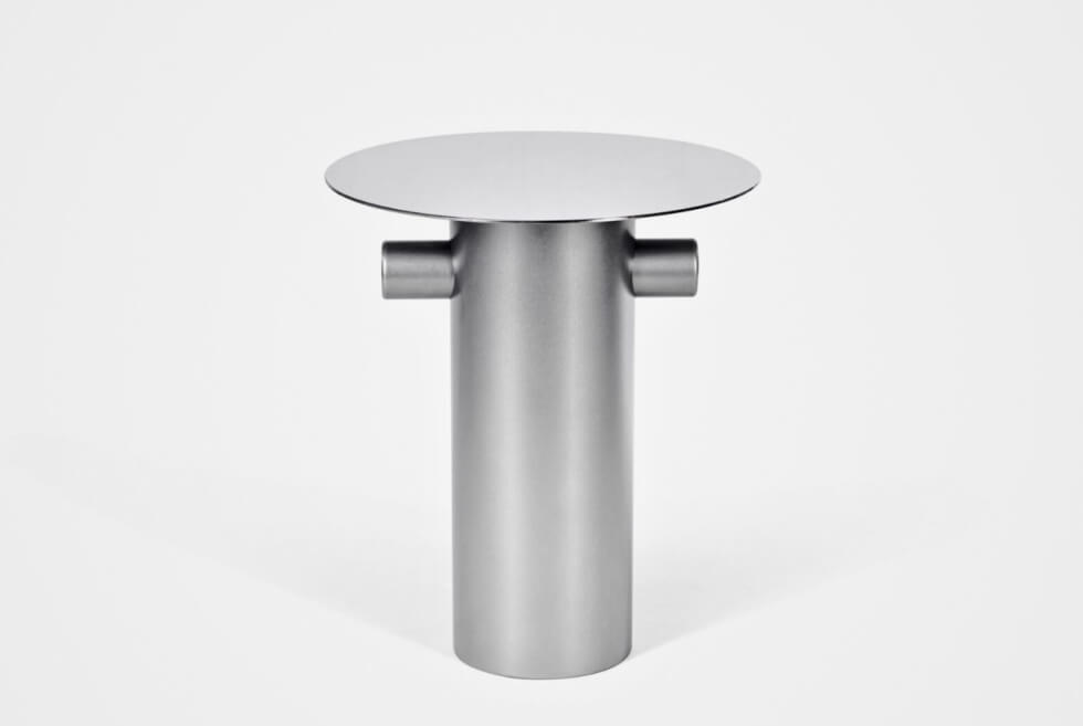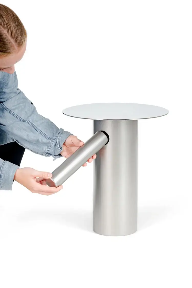 It appears as one cohesive unit and uniform aesthetic, featuring an all-stainless steel framework. It is a side table with a circular top and stand. But it actually comprises of three components that when taken apart, serves another purpose.