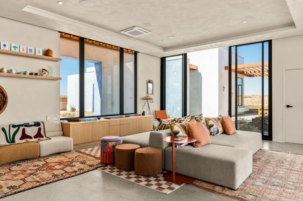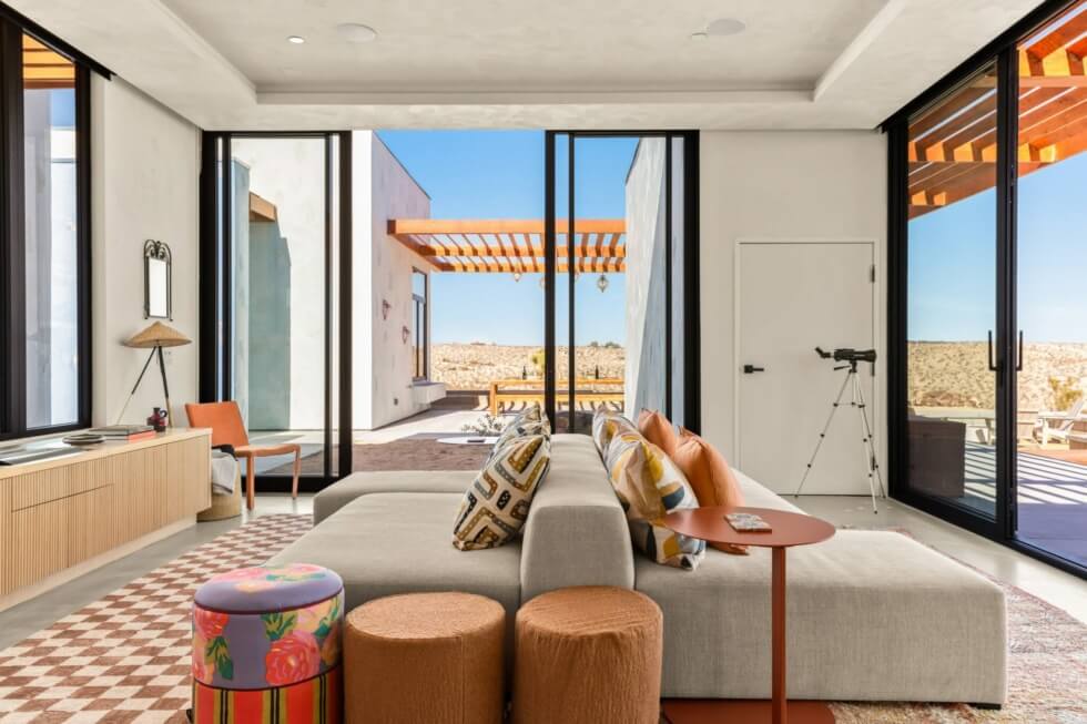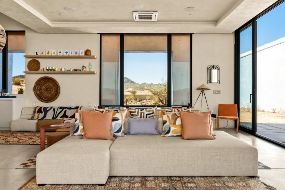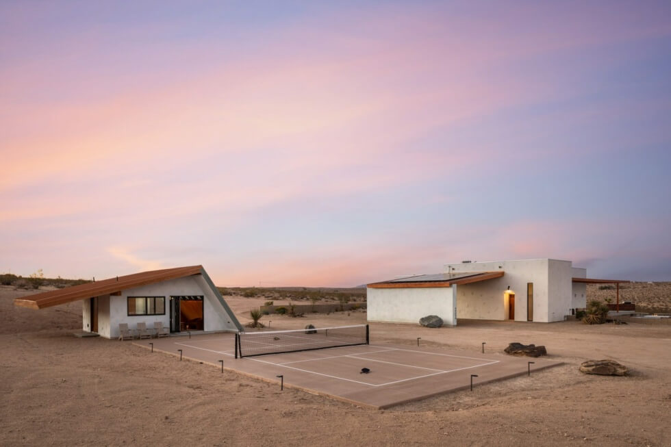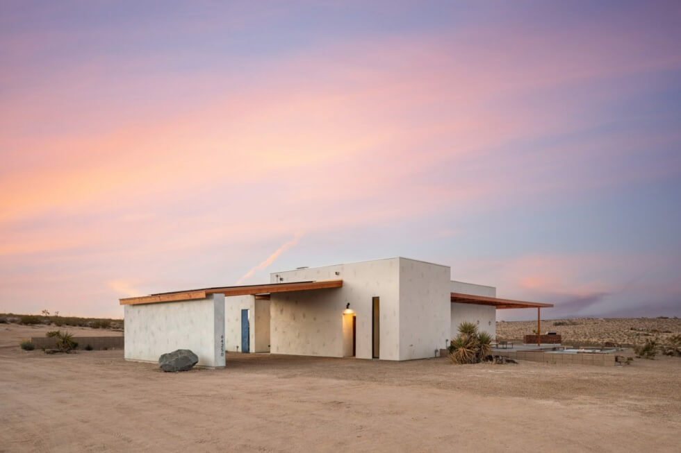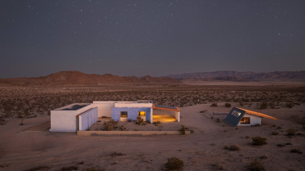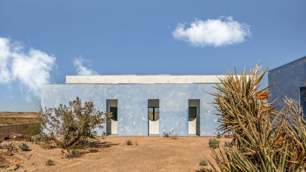 This vacation rental sits perched on a sprawling 10-acre plot that offers sweeping views of the Joshua Tree National Park mountain range. Its facade carefully mirrors the colors of its landscape, with its distinctive cat-face stucco texture washed in five distinct shades of blue to mirror the shifting color of the sky.