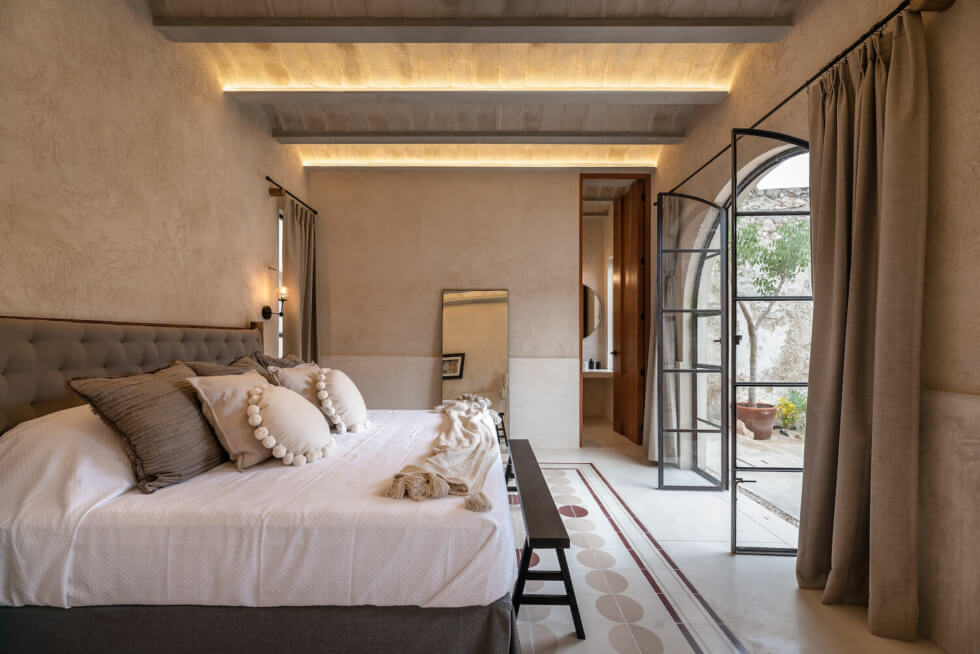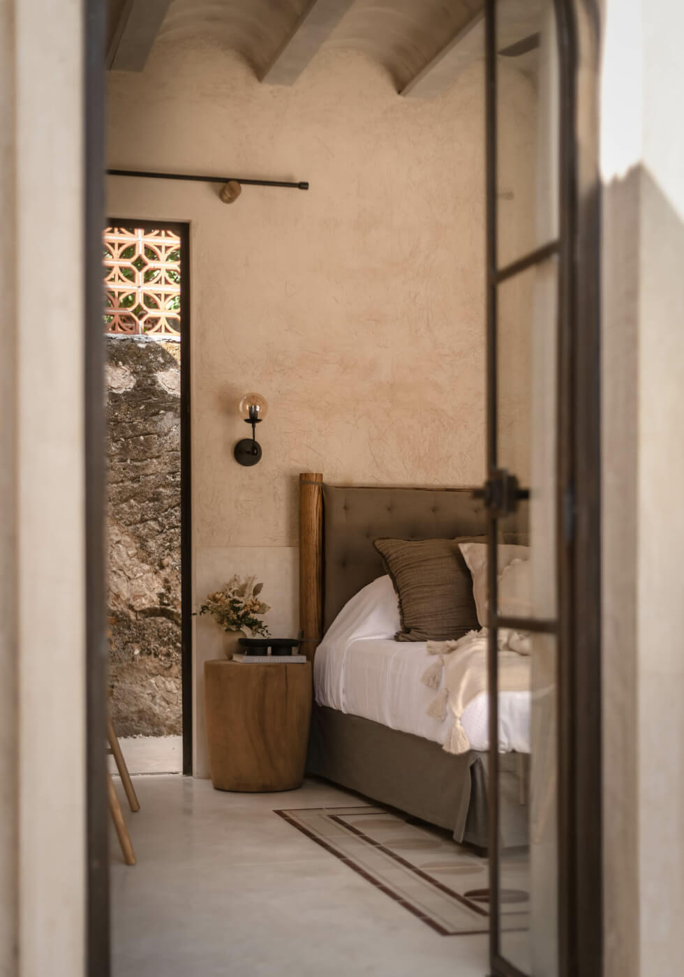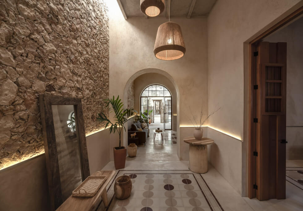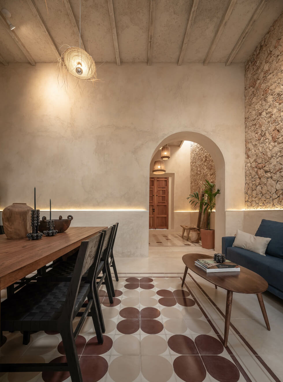 Meanwhile, throughout the interior, the design incorporates neutral and earthy tones and natural textures that lend a timeless and mysterious charm to the house. These include high ceilings and archways. The original halls host the main lobby, the dining and kitchen, and the secondary bedroom and open area with a living room.