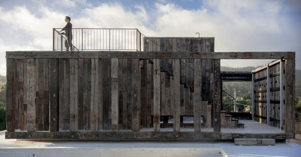 Moreover, Casa Machagua features a second, smaller rustic volume. It comes completely clad in oak and houses the primary bedroom and private terrace. This volume also hosts the third terrace that comes with a 360-degree view of the sea and a grill on a large oak counter with a black stone surface. There is also a large outdoor staircase that connects the three terraces to create more outdoor space.