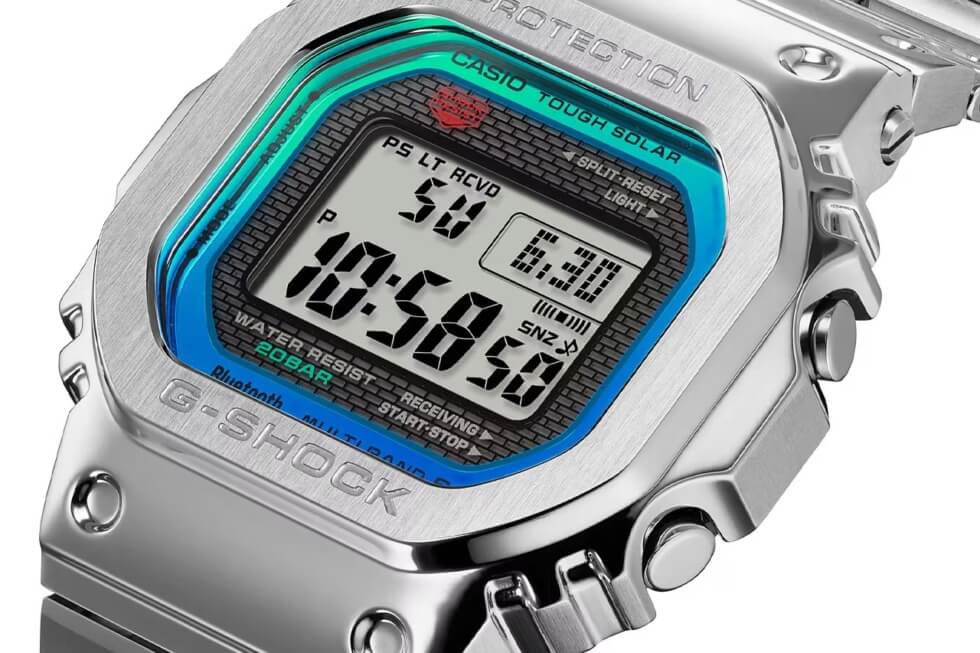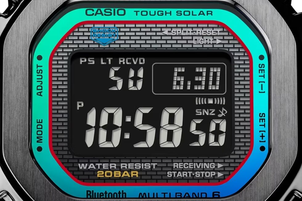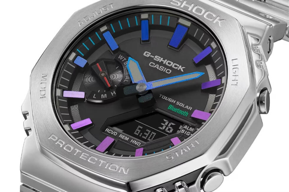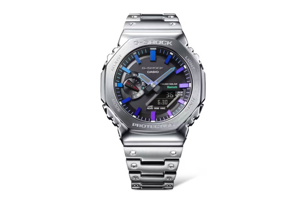 An octagonal bezel frames a mineral glass cover which protects the TN-LCD display bordered by the familiar brick pattern. The outer perimeter of the dial flaunts a blue/green gradation created by a glass vapor deposition process. Meanwhile, the more colorful options in the G-SHOCK Full Metal Polychromatic collection are the 2100 series.