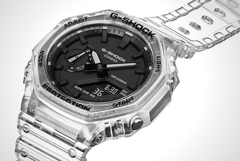 Of course, as the G-SHOCK designation implies, the GA2100SKE-7A will brush off almost anything you dish out. The octagonal outline of the transparent case holds four buttons on each corner. You can use these to toggle the settings, functions, and even light it up in the dark.
