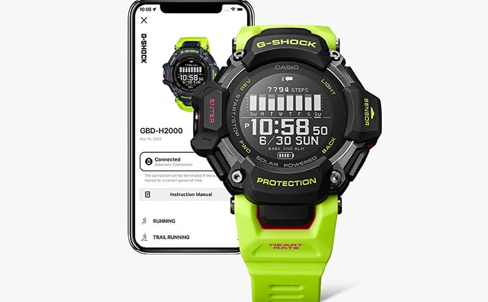 The GBD-H2000 is outfitted with an array of sensors to track various data. Casio lists a magnetometer, thermometer, accelerometer, gyroscope, barometer, and optical heart rate unit. It also touts a GPS system for accurate location readings whenever applicable. Set targets and get an overview of your performance while swimming, running, cycling, walking, working out, and more.