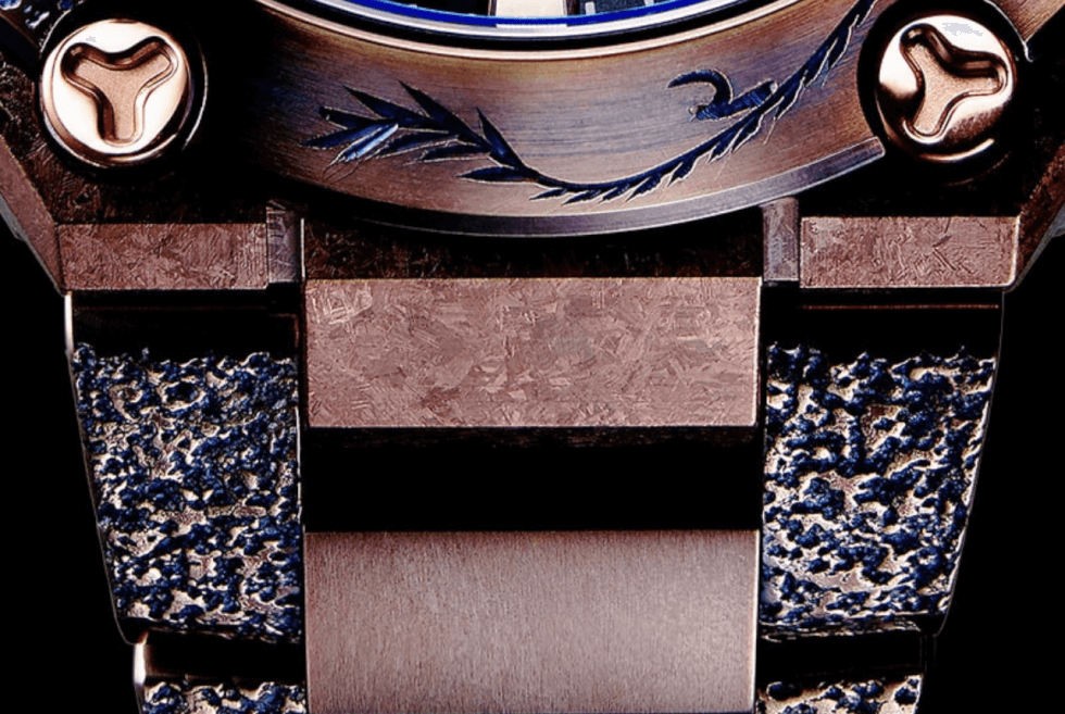 According to the manufacturer, the engraving was hand-carved by a metalsmith who specializes in a technique called chasing. The outline is of a dragon which starts from the 3 o’clock to 6 o’clock section of the bezel. Moreover, the pattern on the metal is the result of a special die that simulates the look of rusted steel. Equally notable is the treatment process the Shougeki-Maru’s titanium case and band undergo to produce the navy blue accents that contrast the brown AIP.