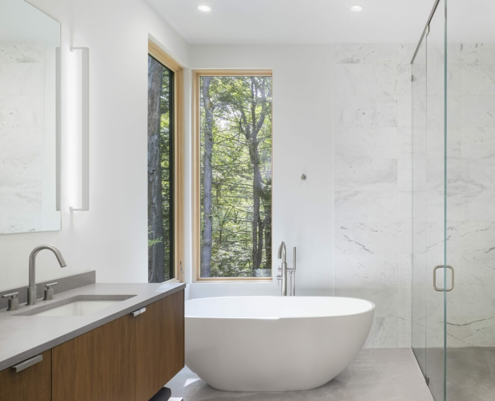 Meanwhile, thoughtfully curated interior designs complement the topography. There are original artworks and custom-built pieces fabricated by local furniture maker Braxton Alexander. The main suite of the Cat Hill House also boasts a spacious freestanding bathtub set next to a corner window at the southern part of the house.