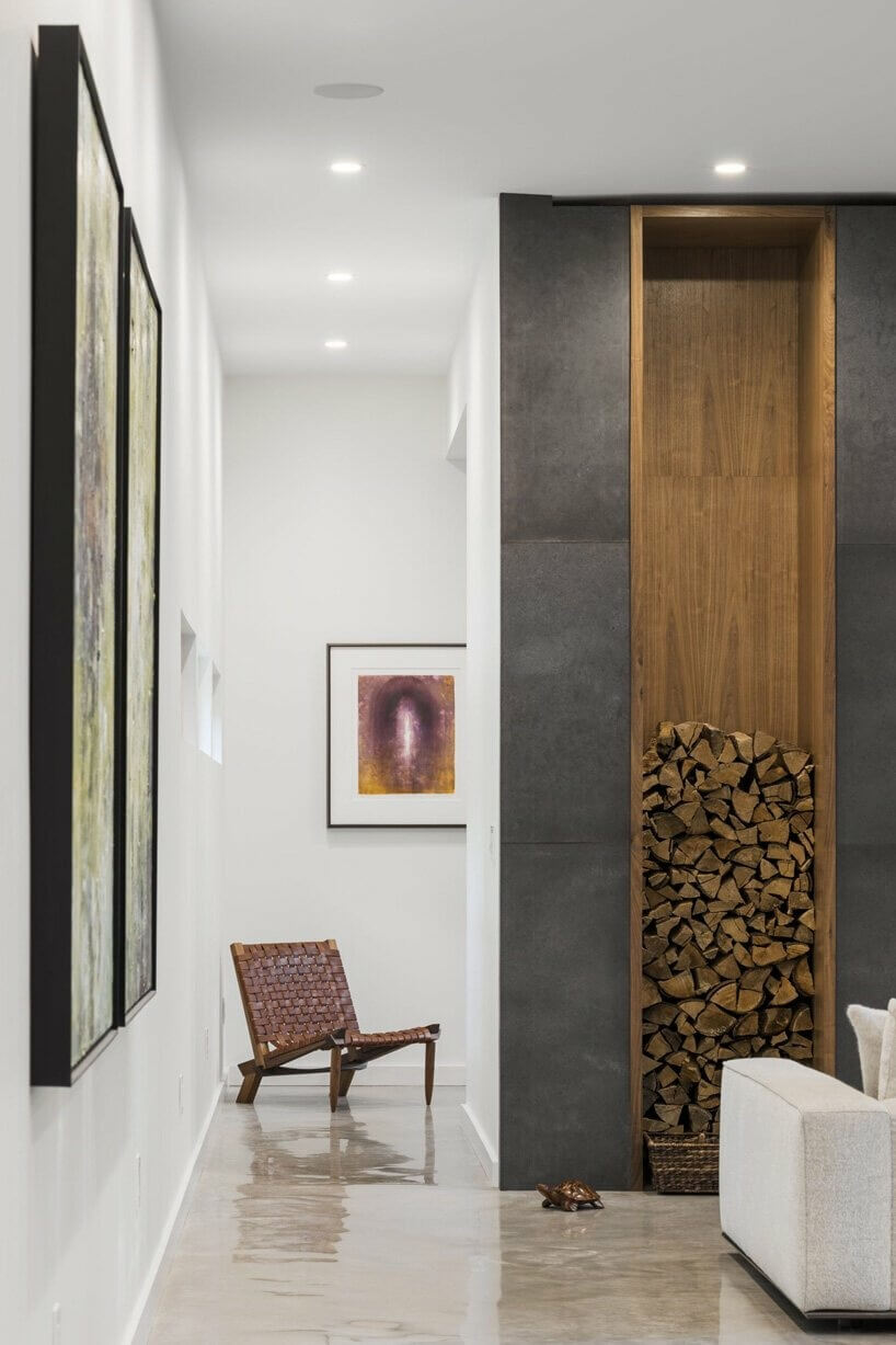 Thus, the Cat Hill House was born. At the heart of the design is a glass-enclosed fitness studio that extends over the ridge. It appears to float above the ground amid its steep topography. The studio is accessible via a long, enclosed gallery that follows the ridgeline. It has a treadmill and indoor cycling bike.
