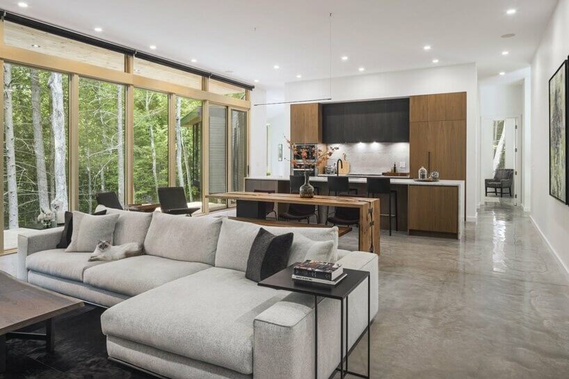 Elsewhere in the home, large glass expansions in the open living room and patio open the eyes to the surrounding wooded landscape. The gently sloping topography outside the main living space gives the feeling of being one with the forest instead of being above them. The windows also provide amazing views of the creek below.