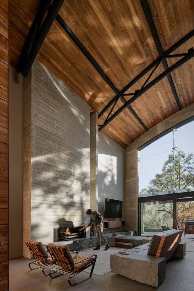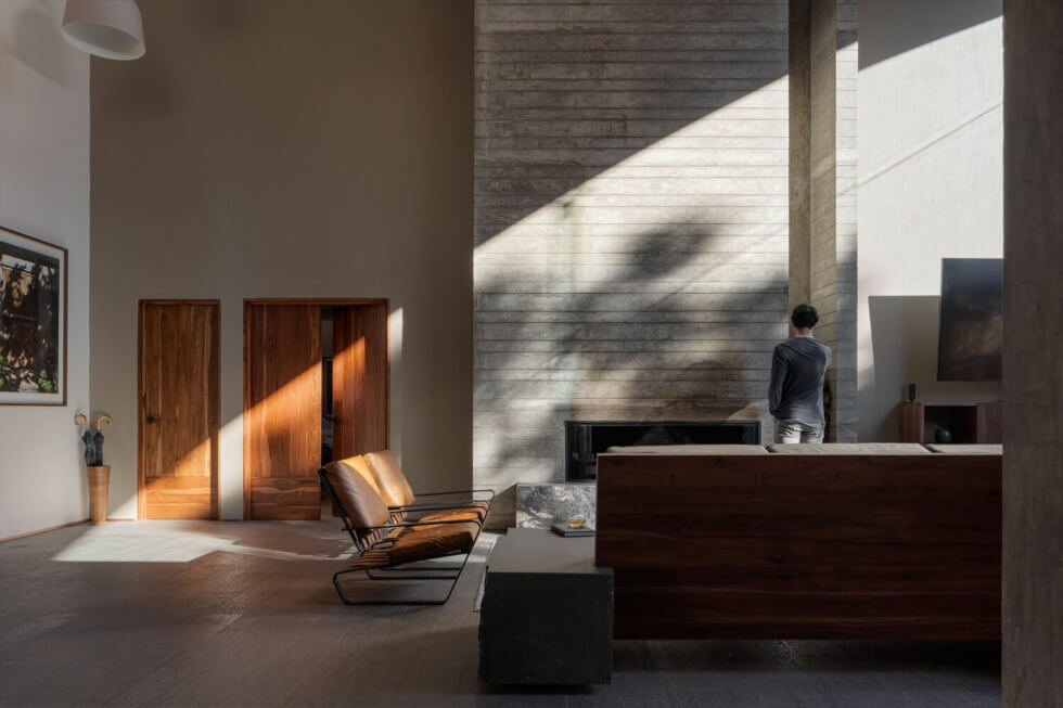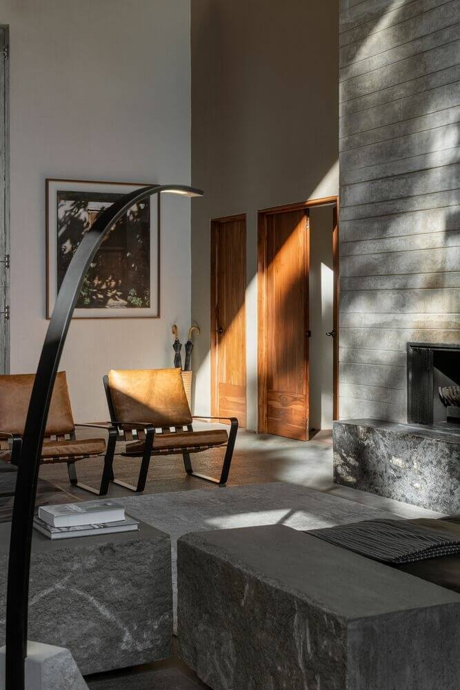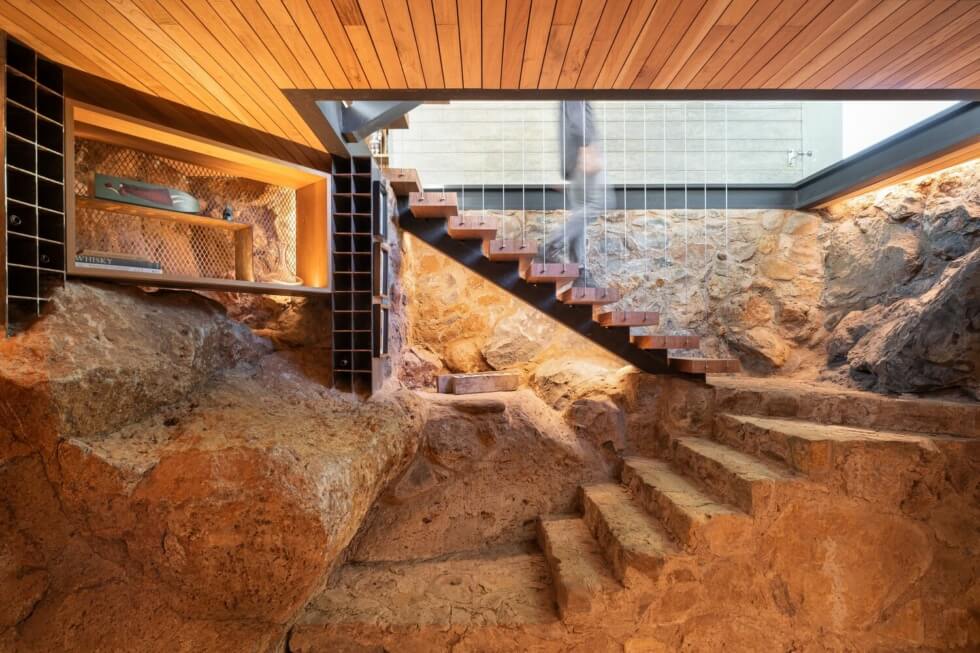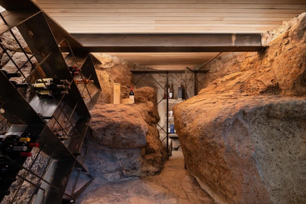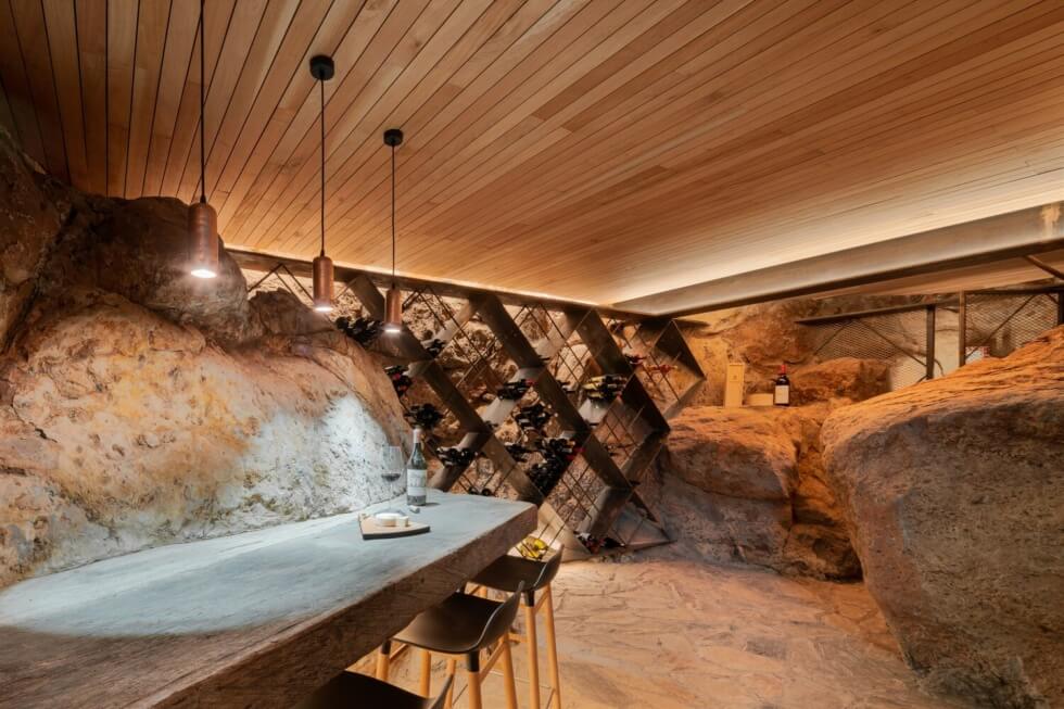 A bar shelf is within reach and fully stocked with various alcoholic beverages for guests to enjoy. The Cava House’s wine cellar might be the star attraction, but the upper level is just as stunning. The double-height volume of its living area even features stone furniture to complement the motif below ground.